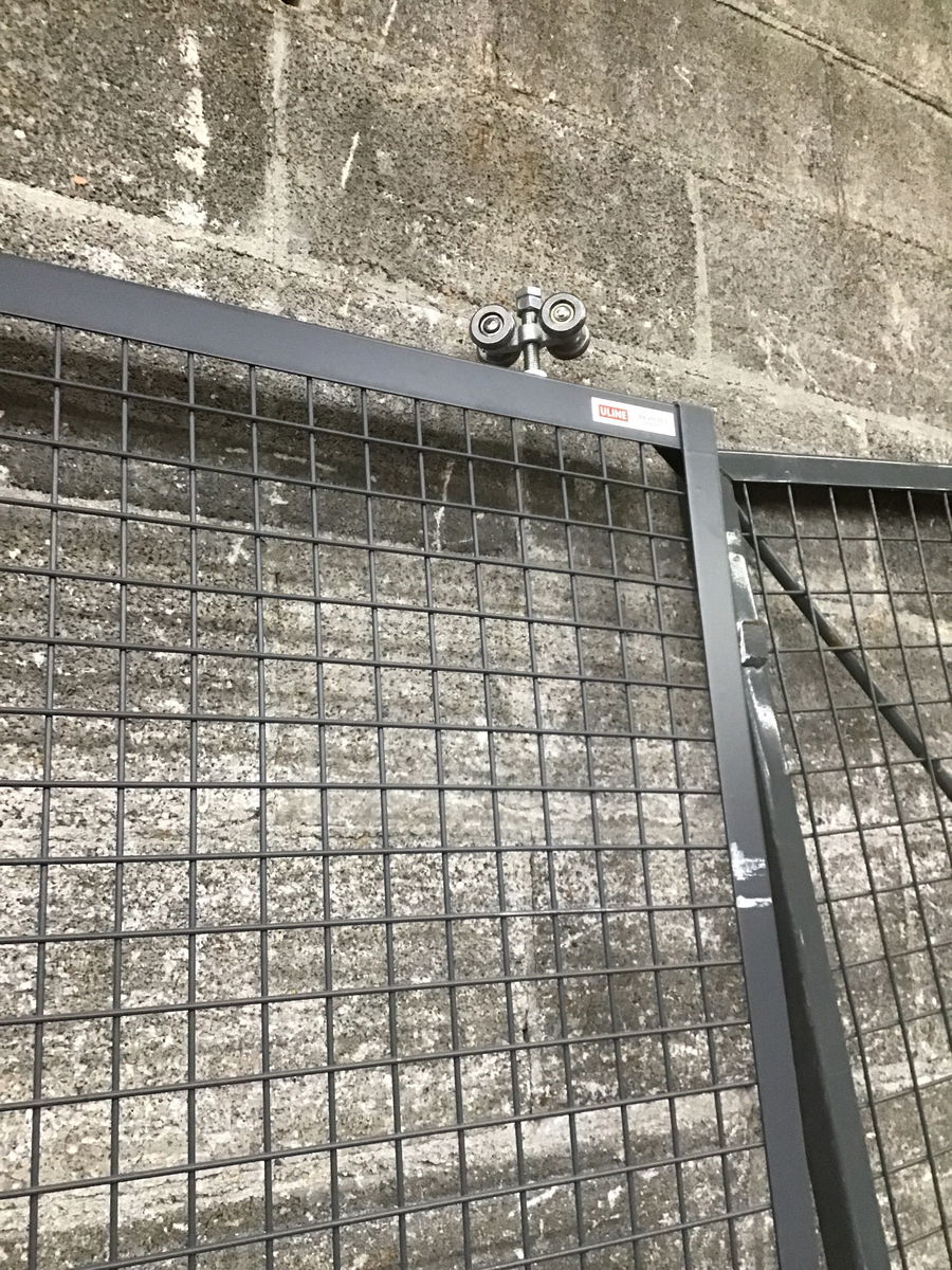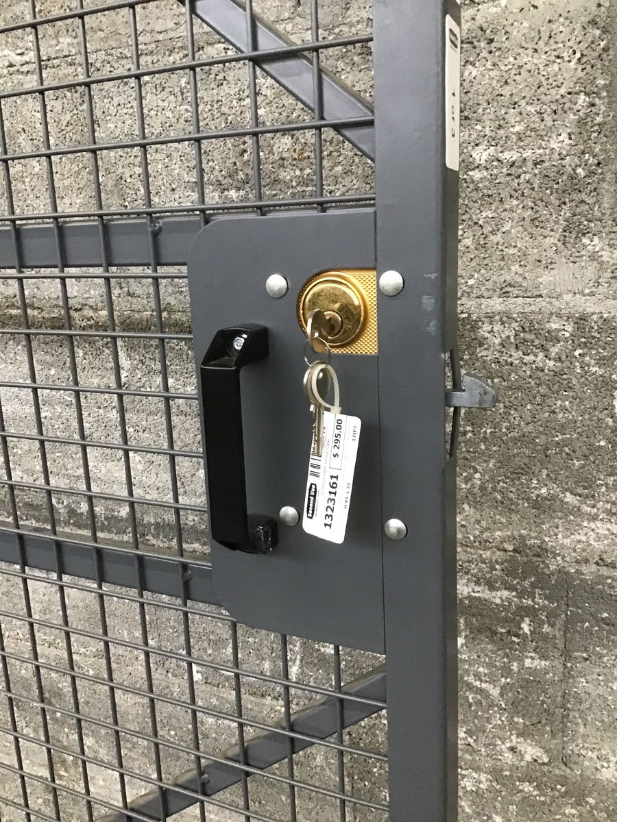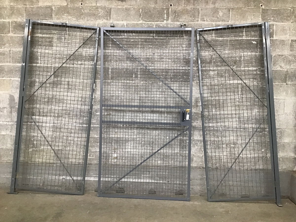This formidable gridded steel fence gate seems like the kind that was once part of a larger steel security cage. It comes with two door panels, measuring 37-5/8" and 35-3/8" wide, and three posts, one for each hinge side and one that mounts between them. The posts each have mounting feet for easy installation. This could certainly continue as a security room door, but I could also see it working well as a fence or cozy driveway gate. Height listed is just for the doors, each mounting post measures 96"H x 2" square. Posts not included in listed width. Comes with keys and a latch