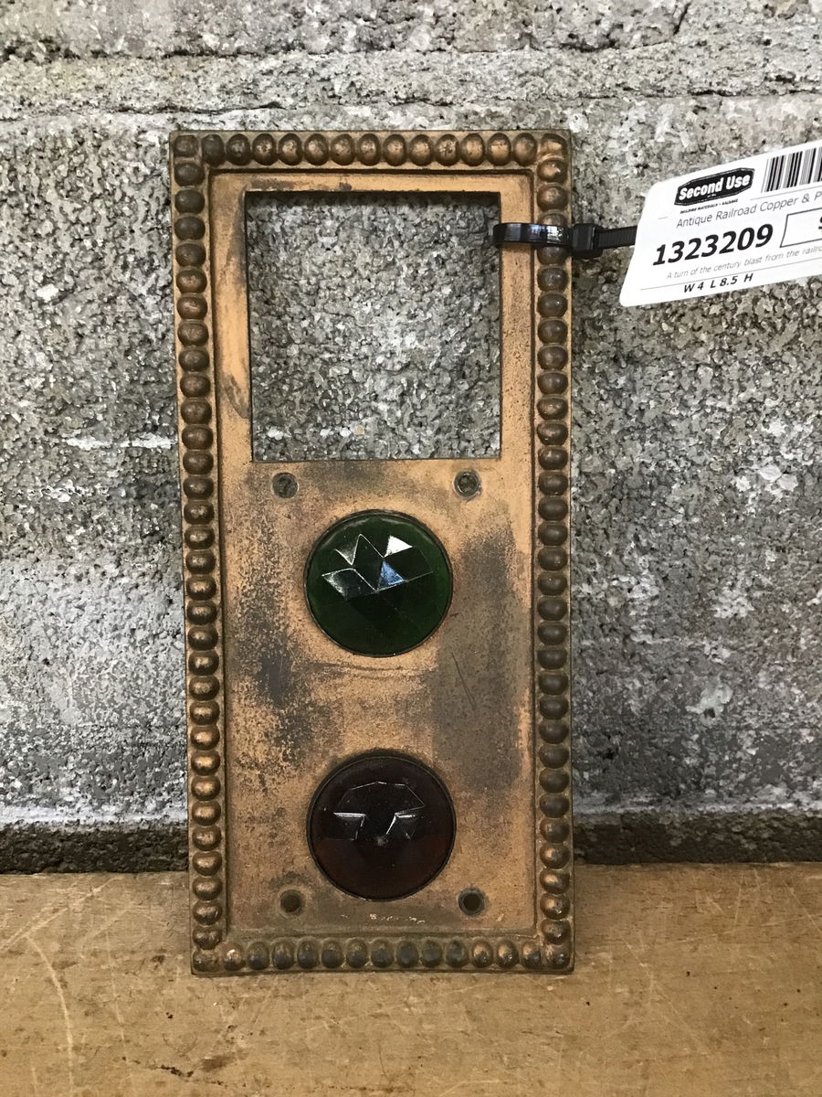 A turn of the century blast from the railroad past, we have here some antique railroad copper plate switch plates with colored prism glass buttons. A total of 6 in stock, five featuring green and red and one green and yellow prism glass buttons. A good gift for the train aficionado in your life, or perhaps repurposed into an automobile?