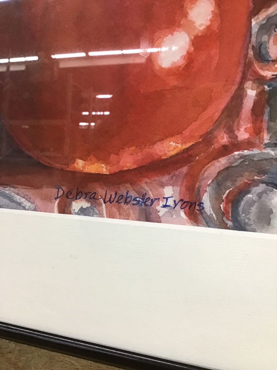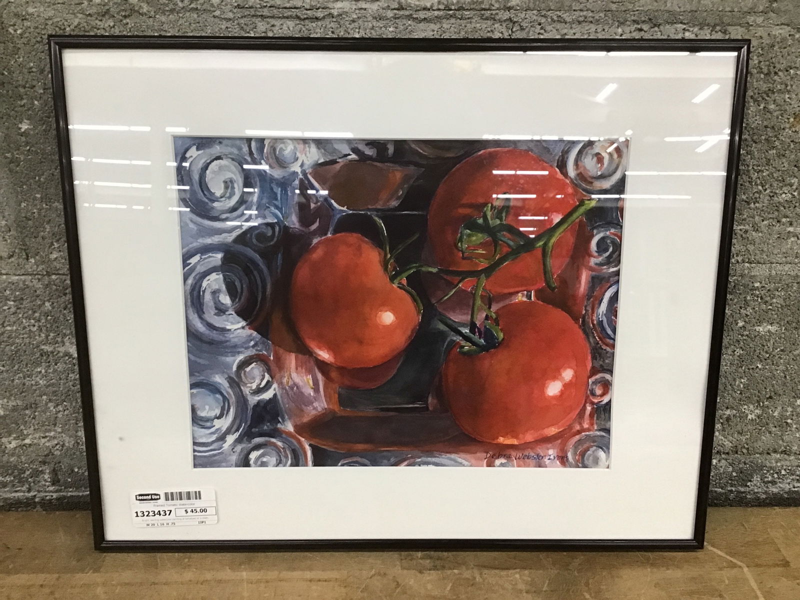 Bright, swirling watercolor painting of tomatoes on a plate, titled "Ripe on the Vine." Has been signed by the artist, Debra Webster Irons, on the bottom. Would make a lovely, colorful addition to your kitchen!