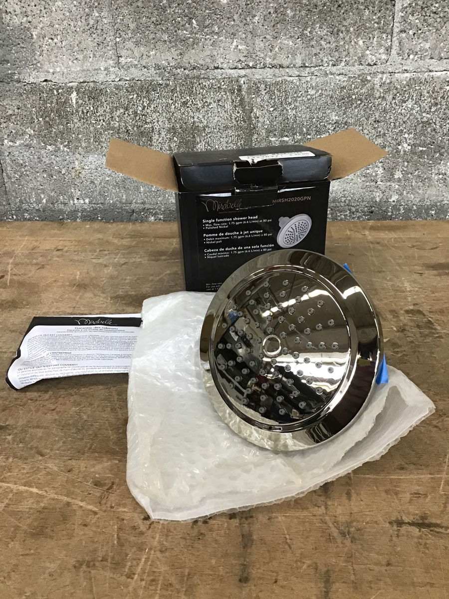 NIB Mirabelle single function shower head in chrome. This item is discontinued, but similar models from Mirabelle's new issue Signature Hardware retail around $100.