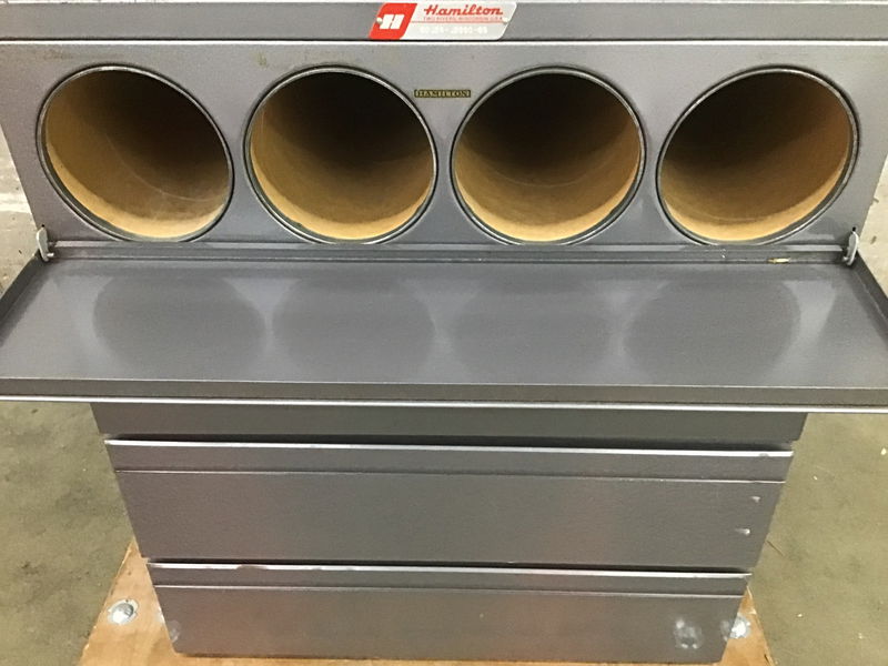 This vintage steel modular storage set is out of this world fun! Made by Hamilton probably sometime 1950-1970s, each unit of this set lifts away for convertible arrangement (includes 2 extra tops). We're told this was meant for rolled storage of maps or architectural plans, and each unit has four 4" diameter tubes inside. Maybe you're a map collector, or we can imagine this used as fabric storage, classroom storage, or even a new life as a fun cat hidey-hole! :3
