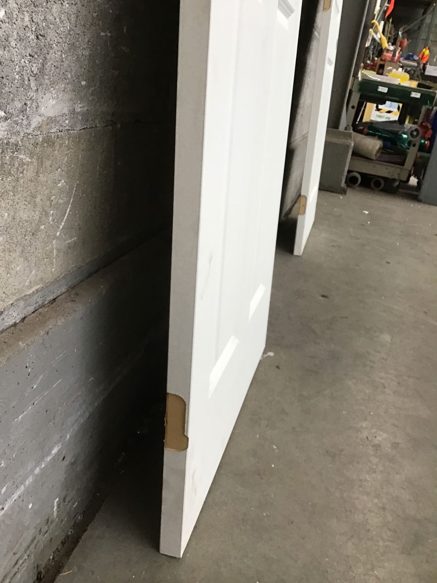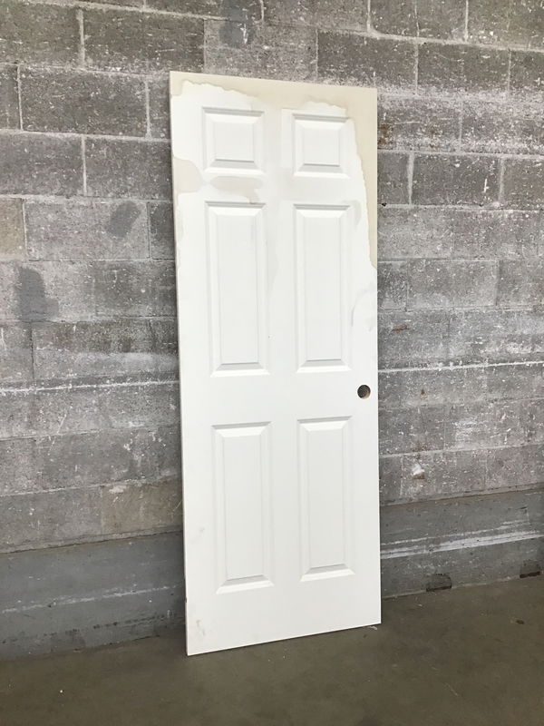 LH Swing HC faux paneled interior door that came to us from the manufacturer as a warehouse clear out due to the hinge cuts being wonky/ unfinished. There is some staining at the bottom but no swelling.