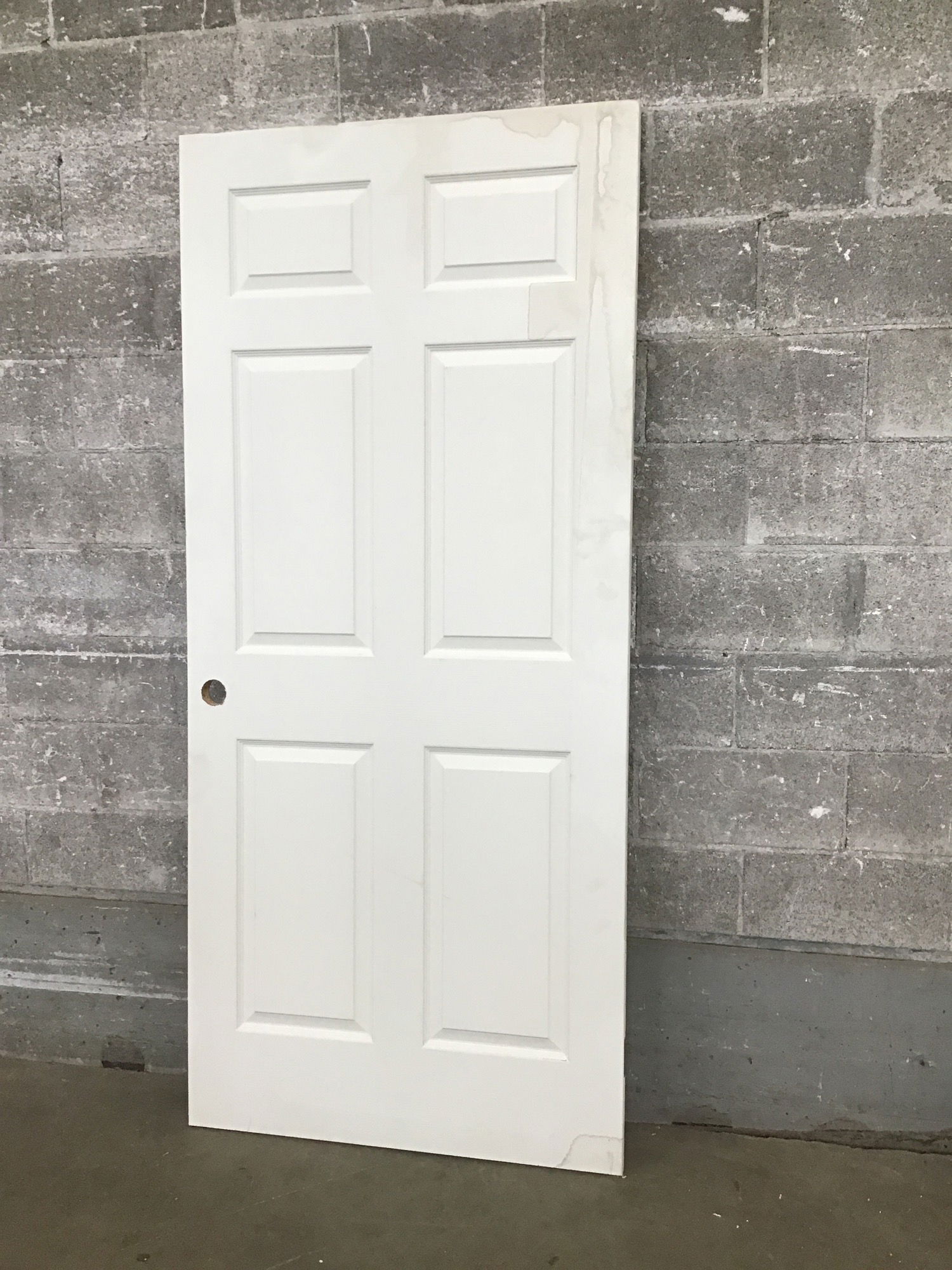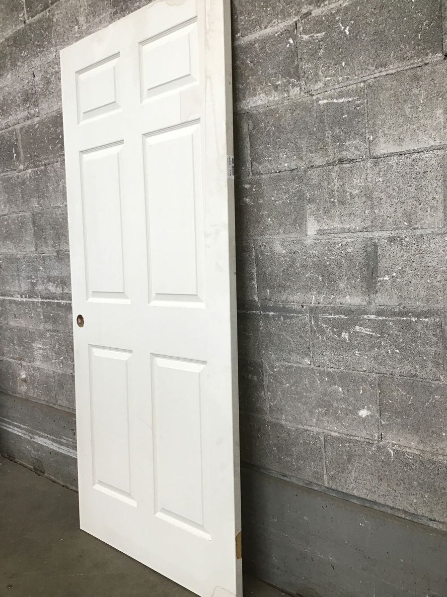 RH Swing Solid core faux- paneled interior door that came to us from the manufacturer as a warehouse clear out due to the hinge cuts being wonky/ unfinished. There is some staining but no swelling.