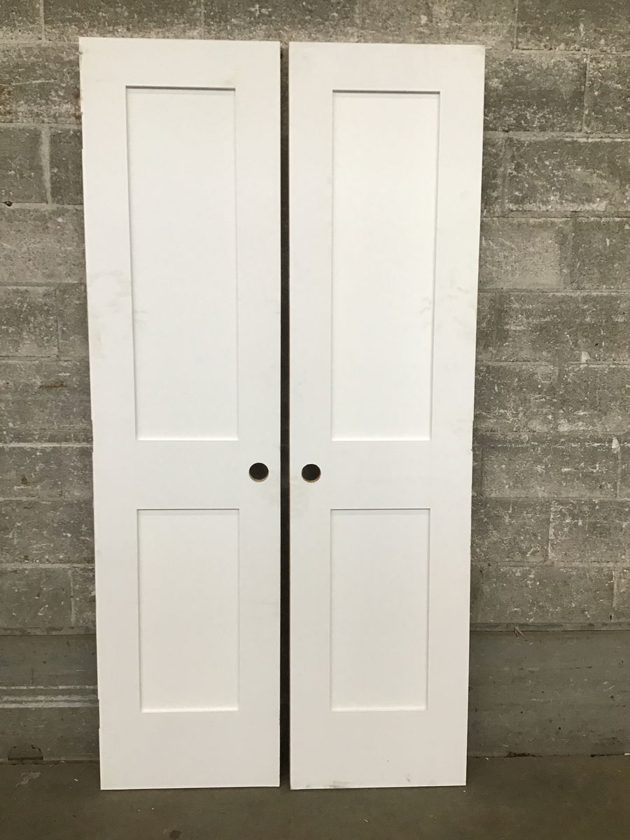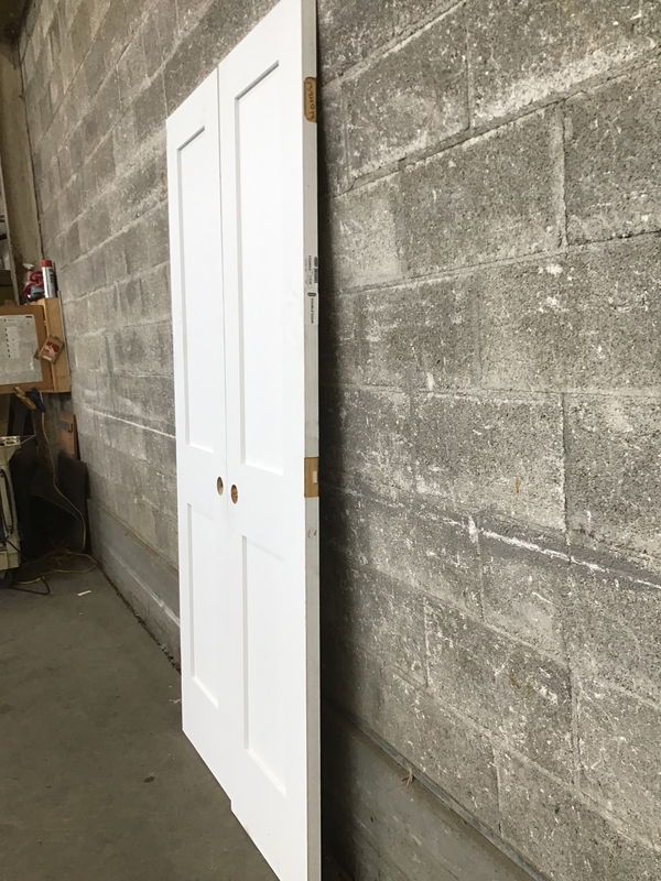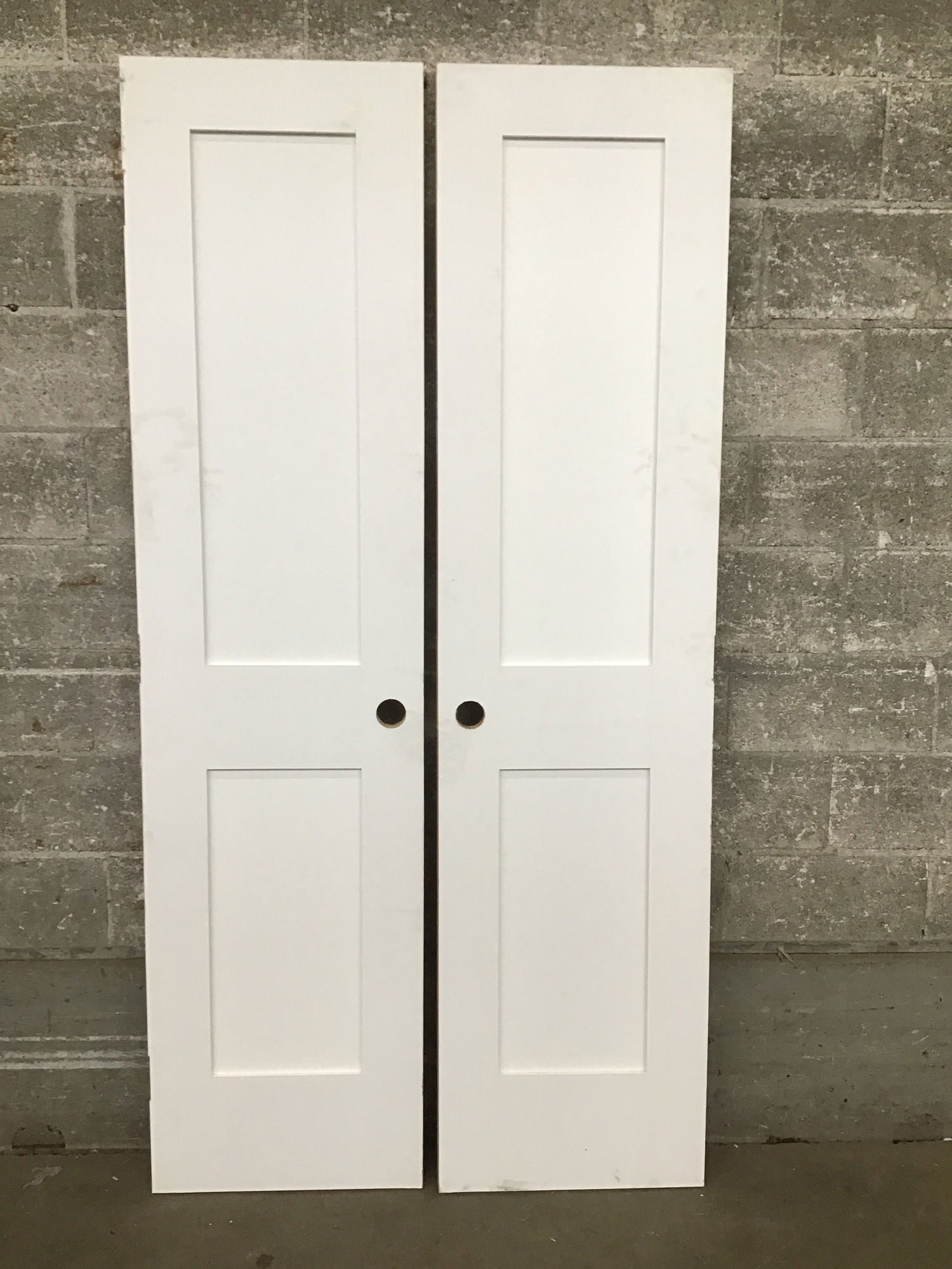 Pair of two panel shaker doors for a 40" opening. Manufacturer reject due to the hinges being all wonky. They're dirty from sitting on a pallet in a warehouse but are not swelling.