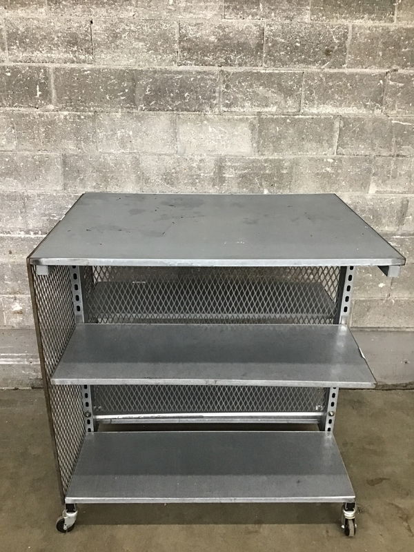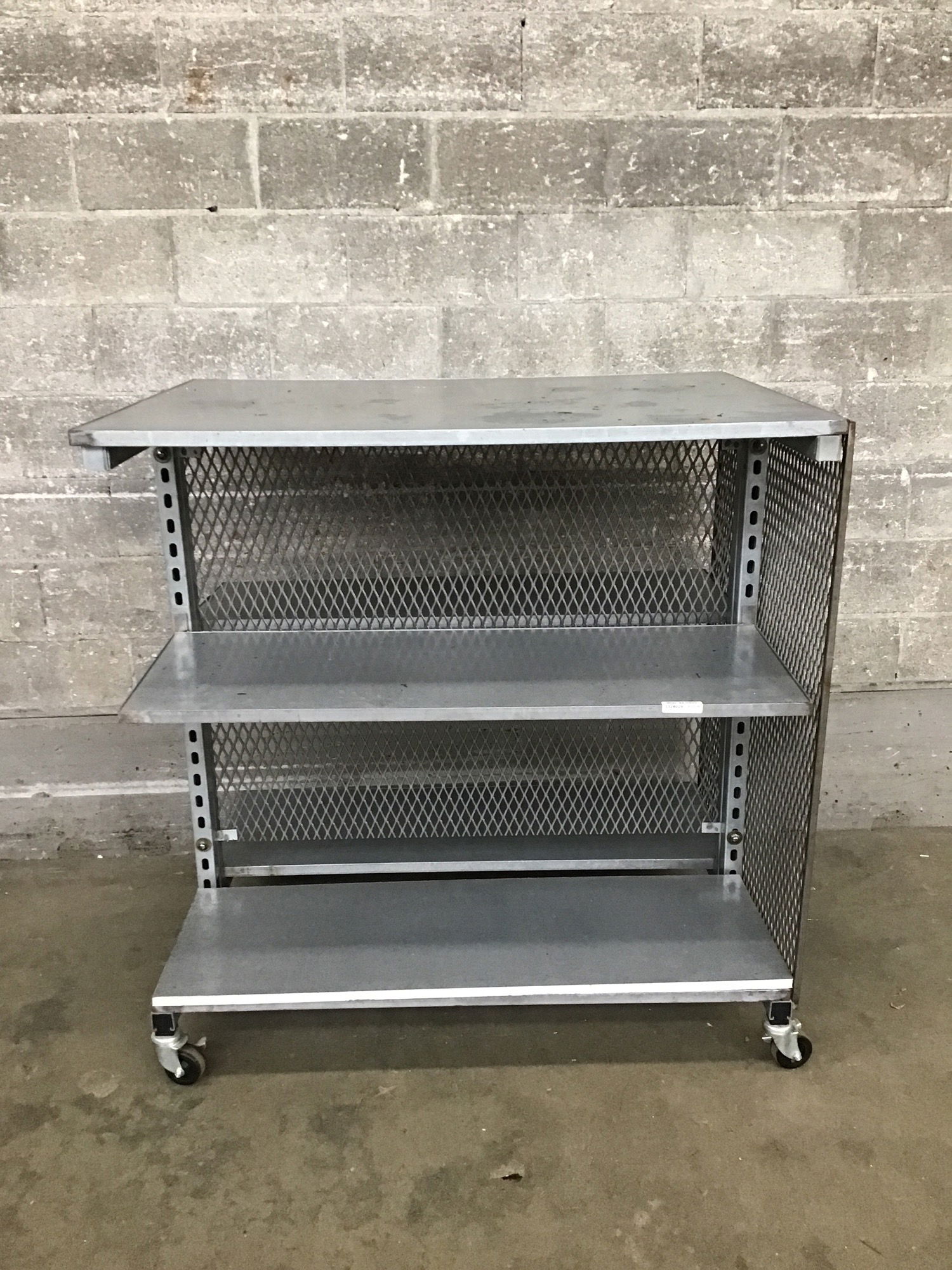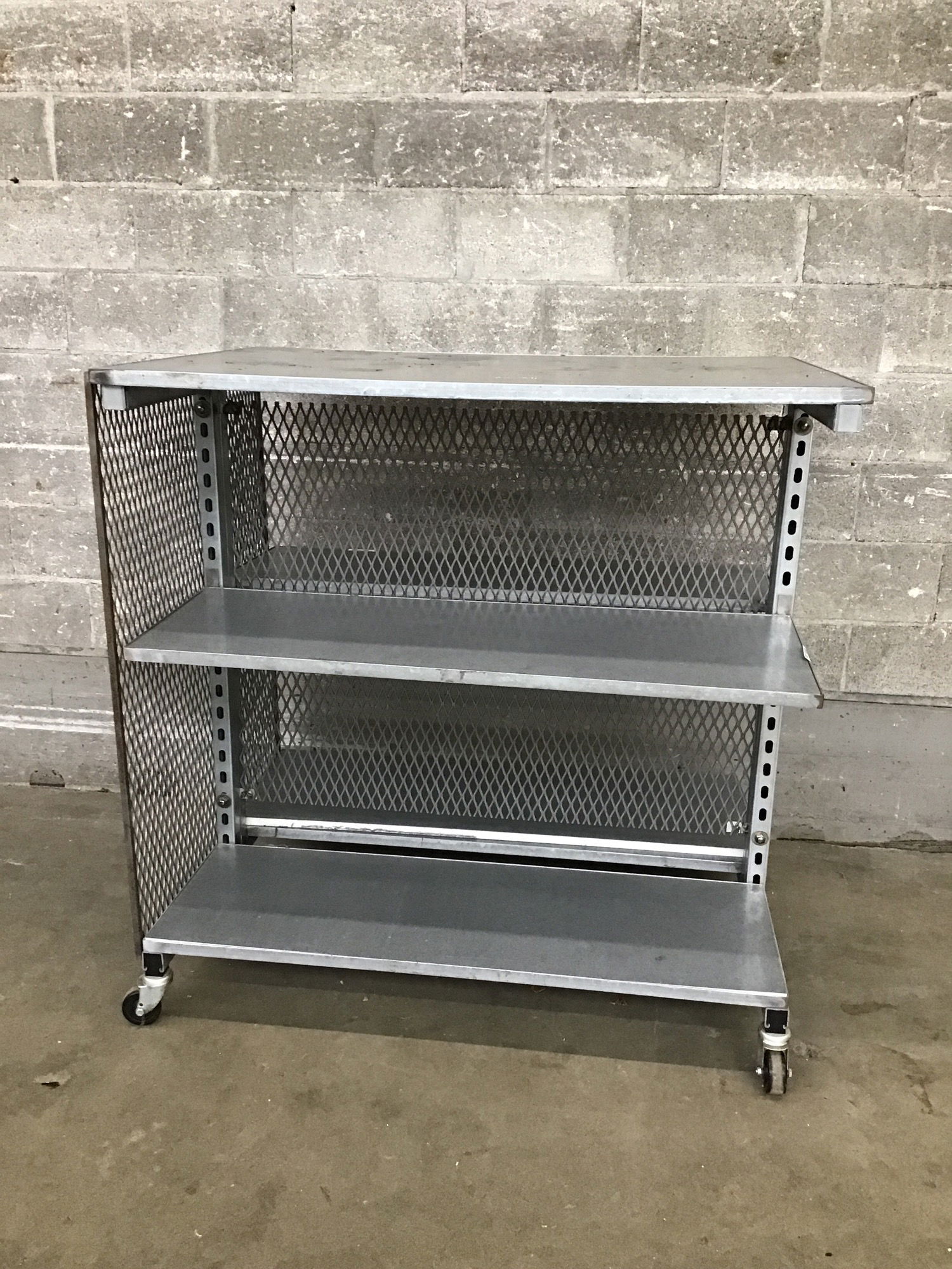 Rolling storage rack with an industrial chic vibe. Has an adjustable shelf on each side and an expanded steel end. Top may be a little loose and need a fastener or two to secure, but it rolls relatively well and all four casters swivel and lock. Item may have cosmetic damage.