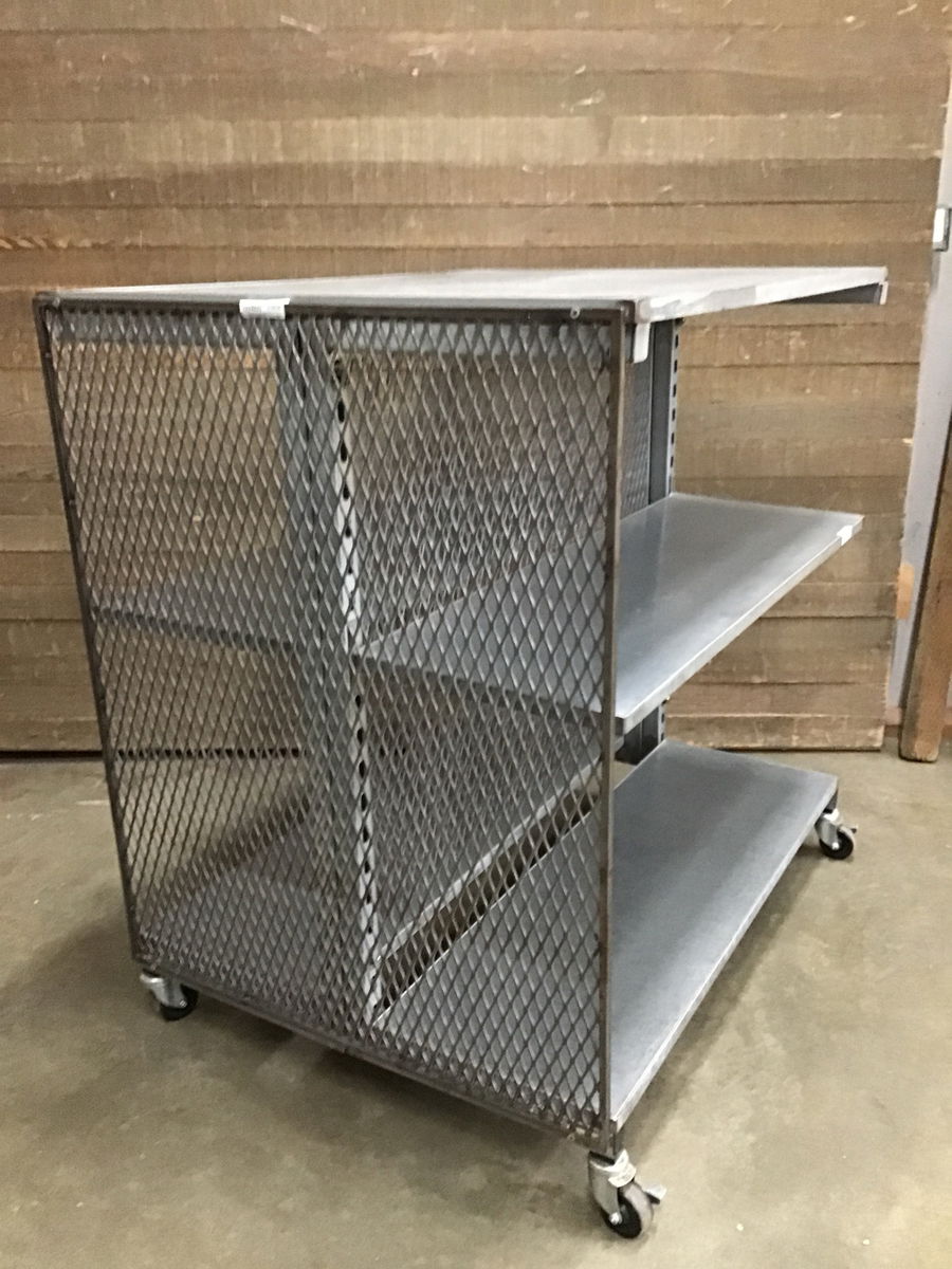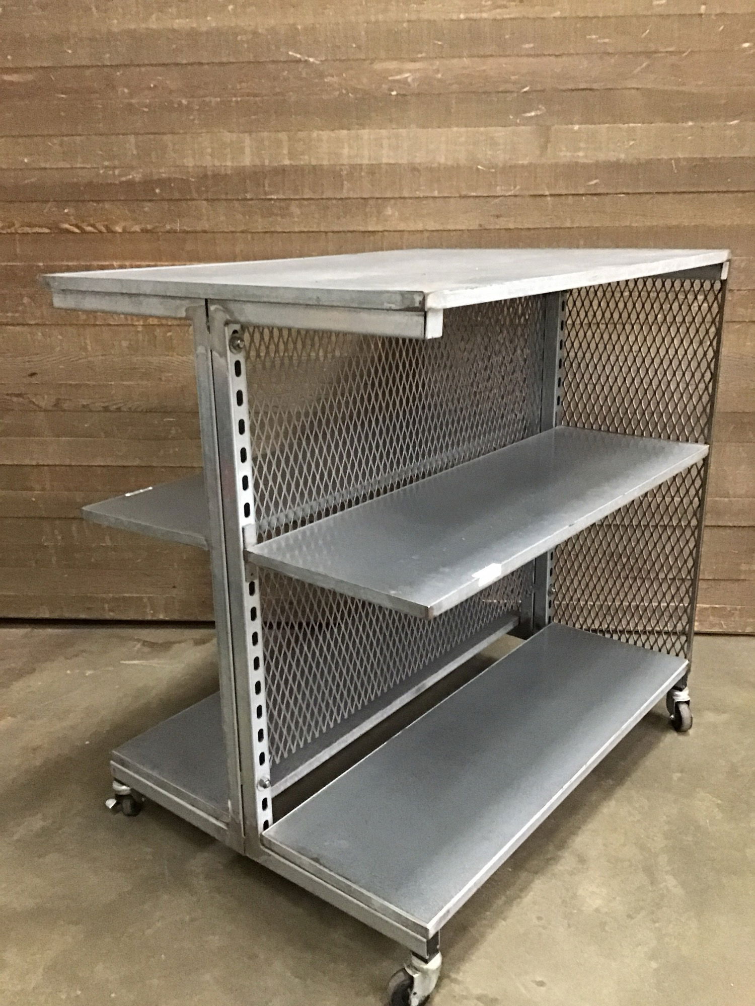 Rolling storage rack with an industrial chic vibe. Has an adjustable shelf on each side and an expanded steel end. Top may be a little loose and need a fastener or two to secure, but it rolls relatively well and all four casters swivel and lock. Item may have cosmetic damage.