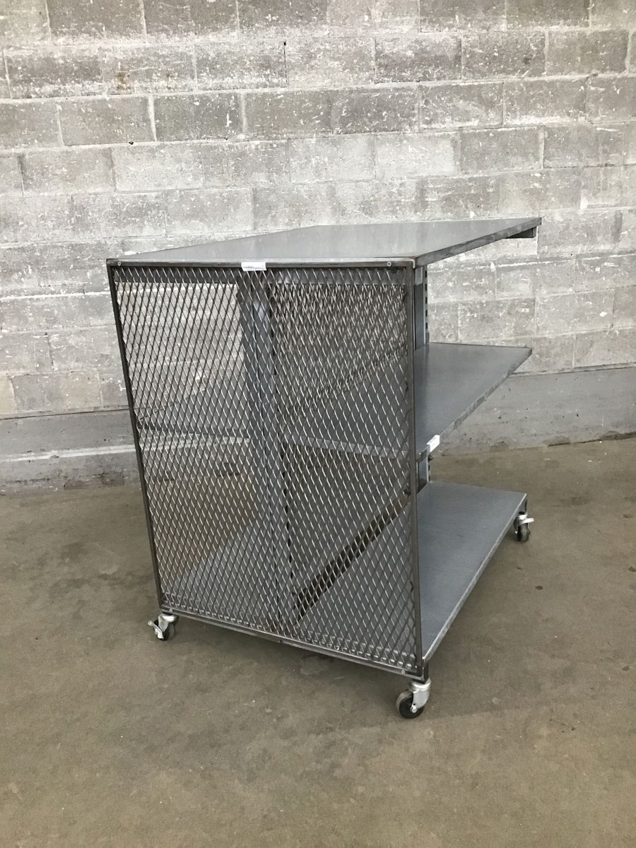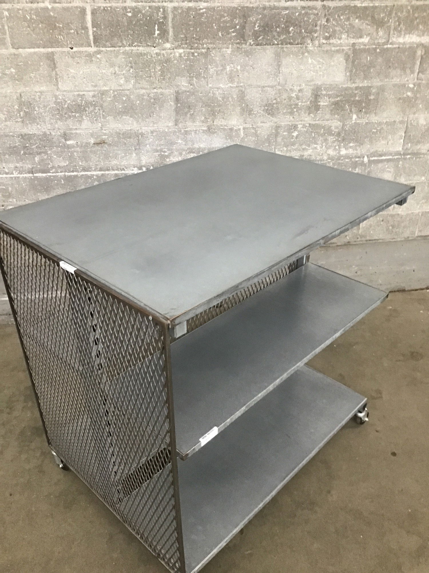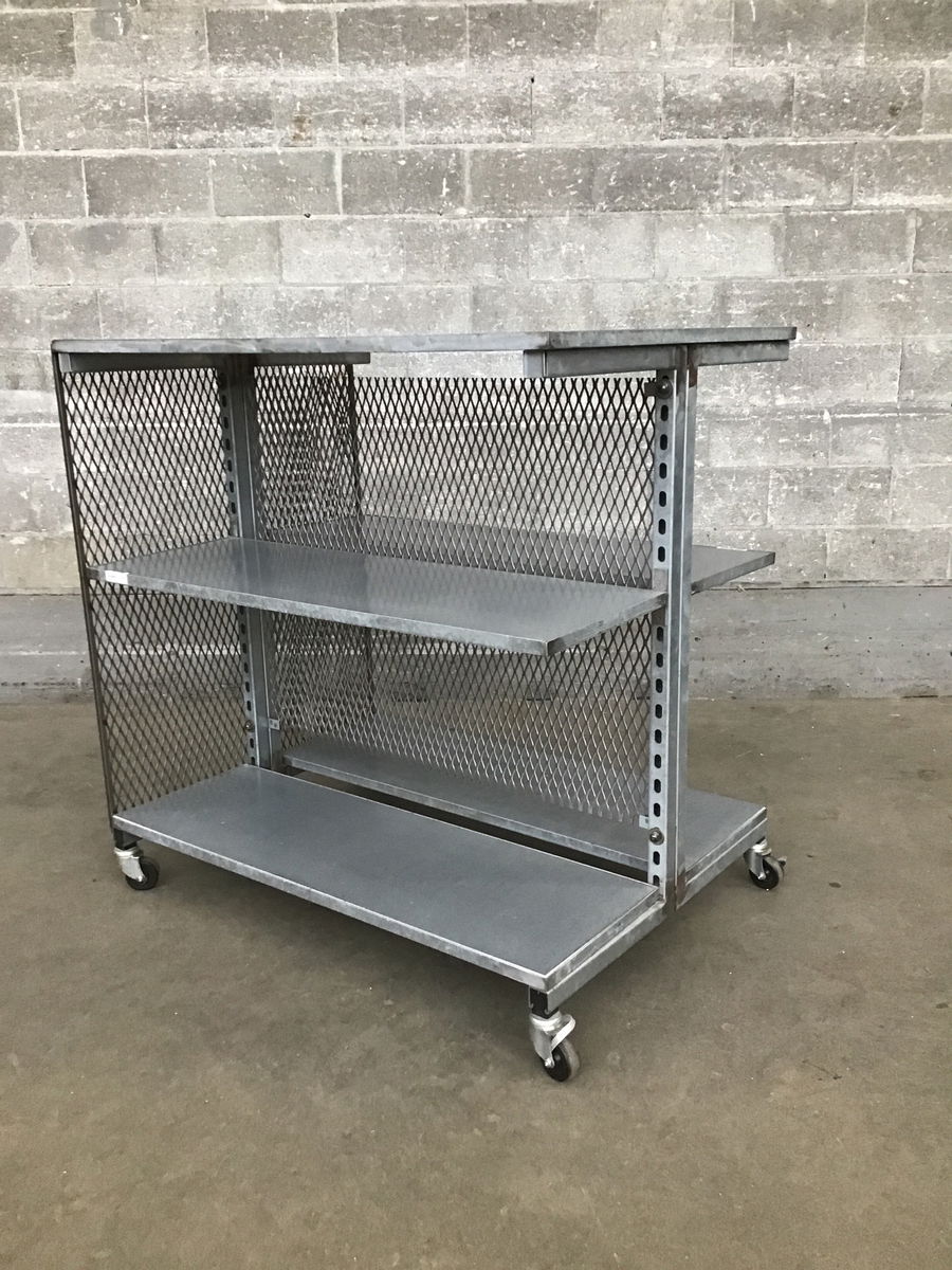 Rolling storage rack with an industrial chic vibe. Has an adjustable shelf on each side and an expanded steel end. Top may be a little loose and need a fastener or two to secure, but it rolls relatively well and all four casters swivel and lock. Item may have cosmetic damage.
