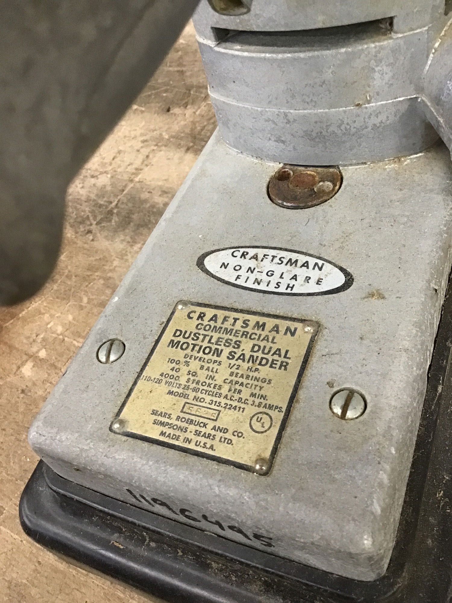 A vintage Craftsman dustless dual motion sander with 1/2 HP, 40 sq. ft. capacity, 4000 strokes per minute, 110 V. Appeared to function when tested in-house.