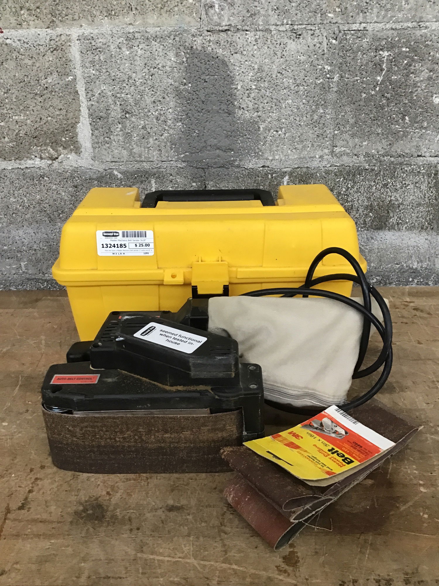 Here we have a Master Mechanic belt sander 3" wide and 8" long. Model MM8575, comes with dust catch, comes in a yellow box and appears to be very functional when tested in house.