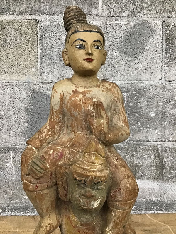 This is a charming and mystical handcarved statue depicting Buddha riding on the shoulders of the Balinese deity Barong. This was carved from a single solid piece of teak.