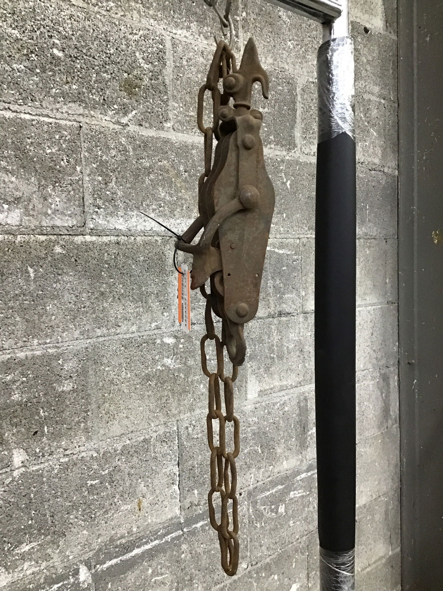 Vintage steel hay loft pulley. Dimensions are approximate.