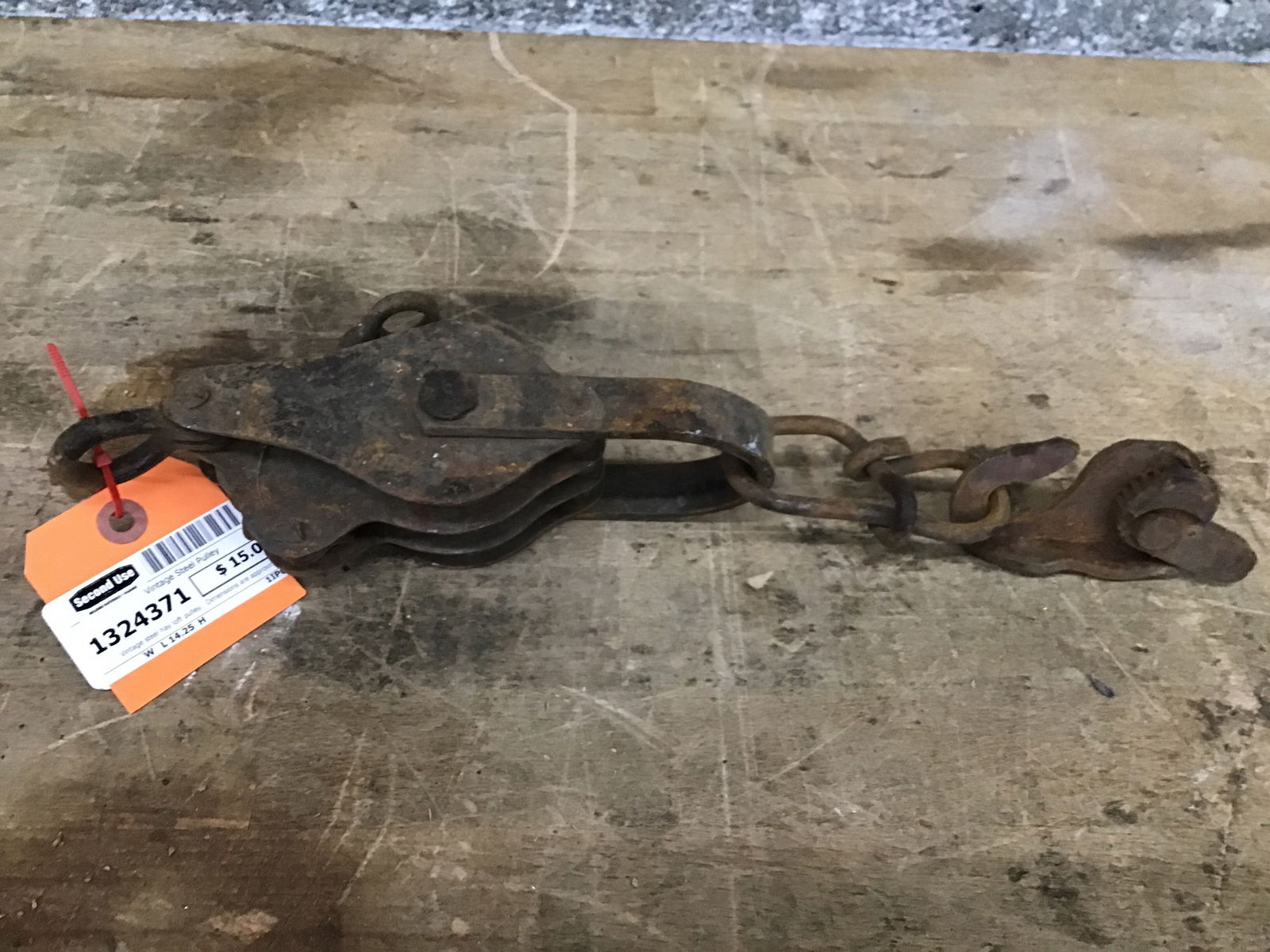 Vintage steel hay loft pulley. Dimensions are approximate.