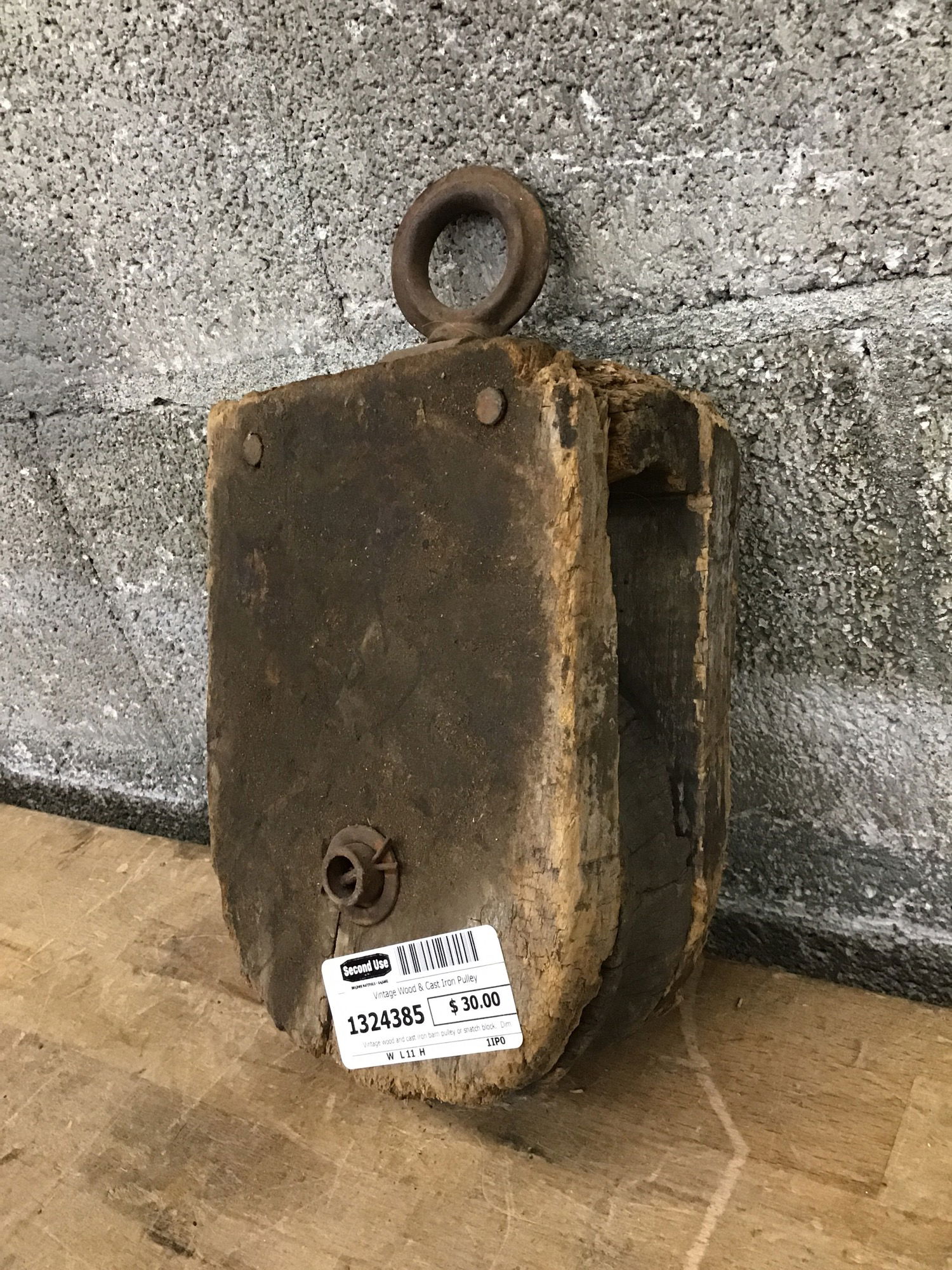 Vintage wood and cast iron barn pulley or snatch block. Dimensions are approximate.