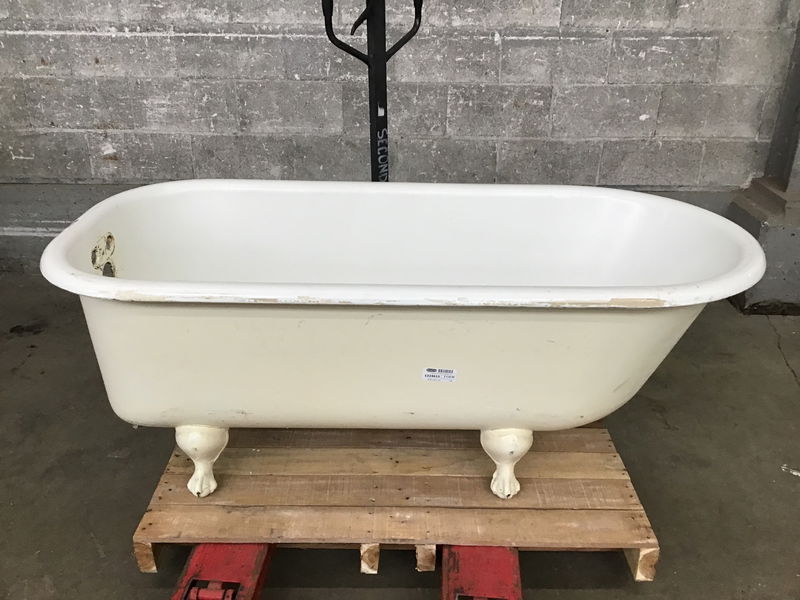 This clawfoot tub has a now peeling off refinish job and there's plenty of excess plumber's putty around the drain to make me think there's some rust under it. All the feet are on it. It's too rough to put in your bathroom, but if you want to put a soaking tub out on the deck or need a dog washing station this is a good option.