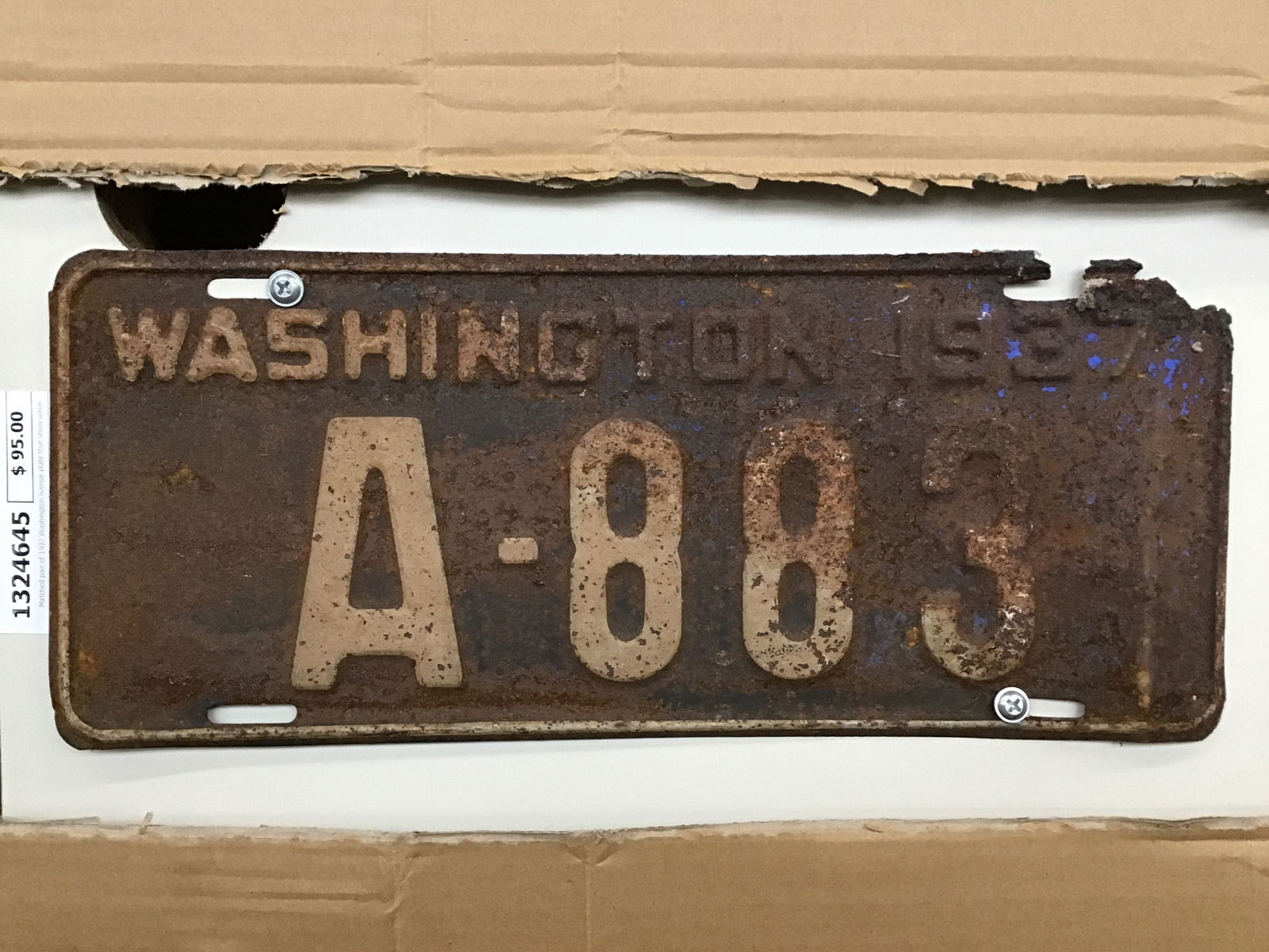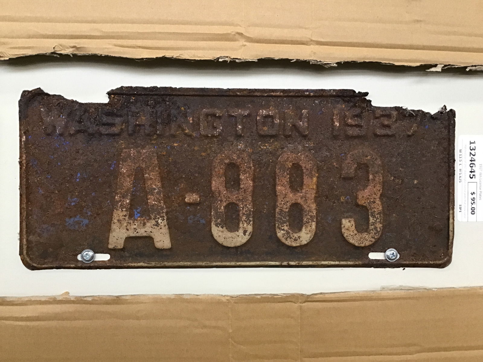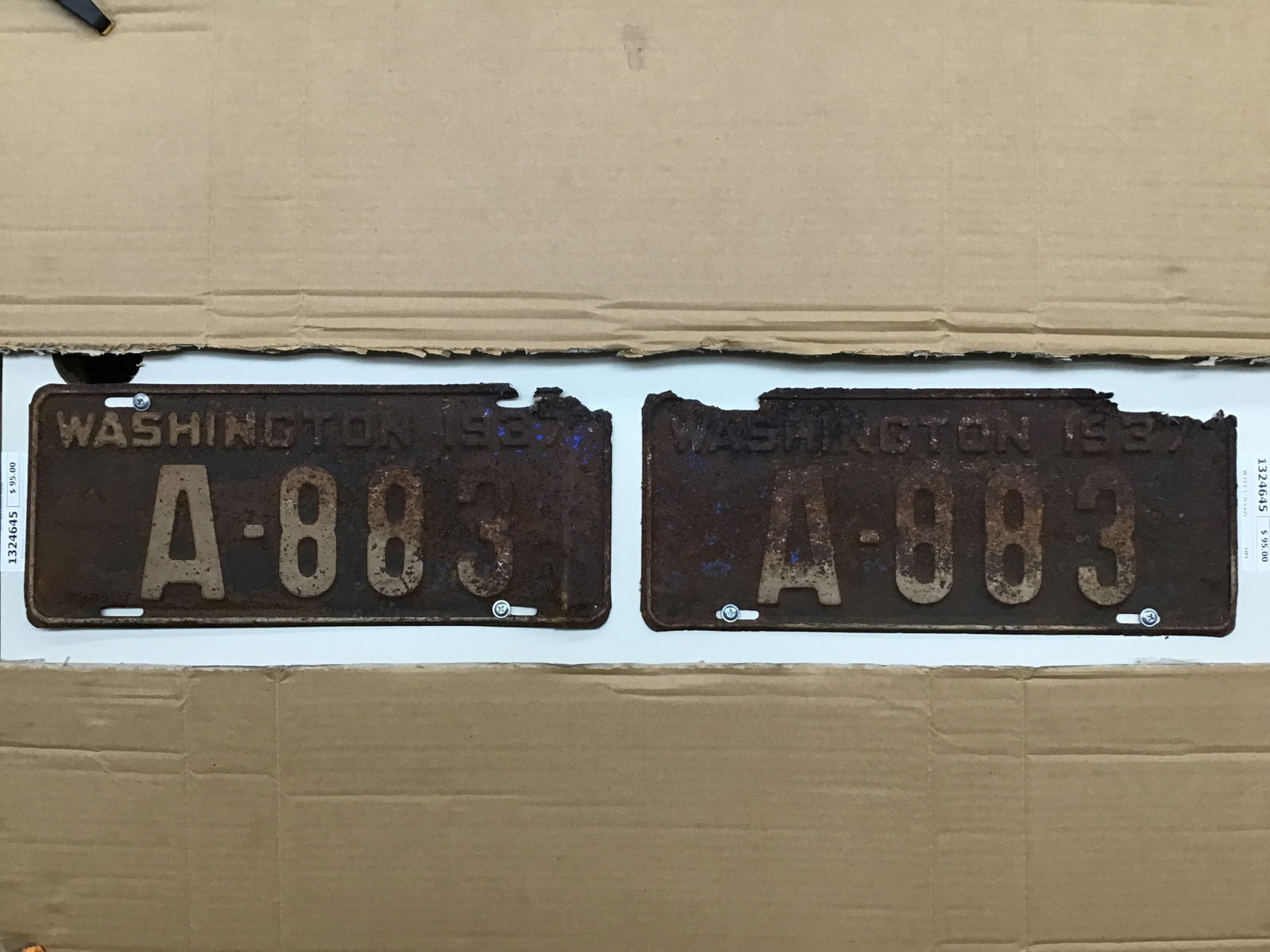 Matched pair of 1937 Washington license plate that show some authentic wear and surface rust. This set is pretty chewed up around the top mounting slots, to the point of them being gone. Price reflects.