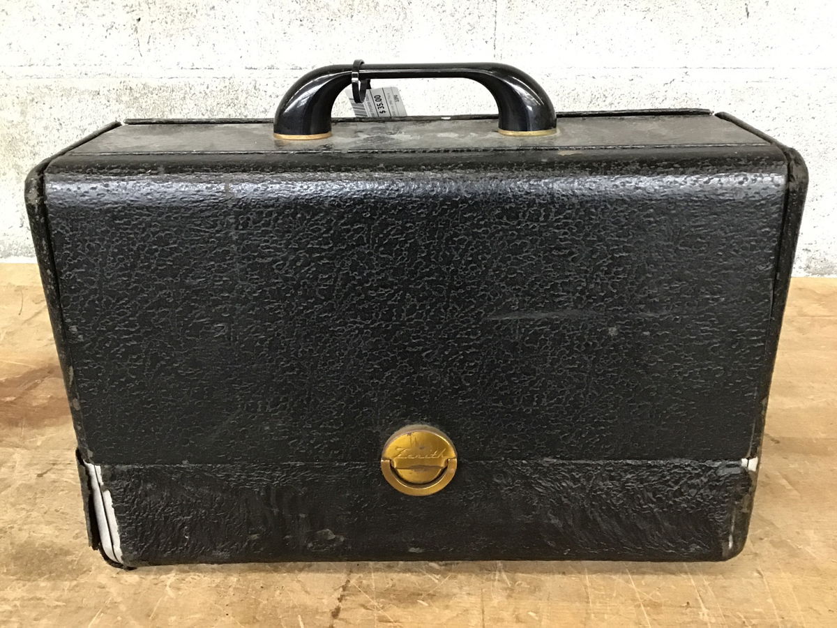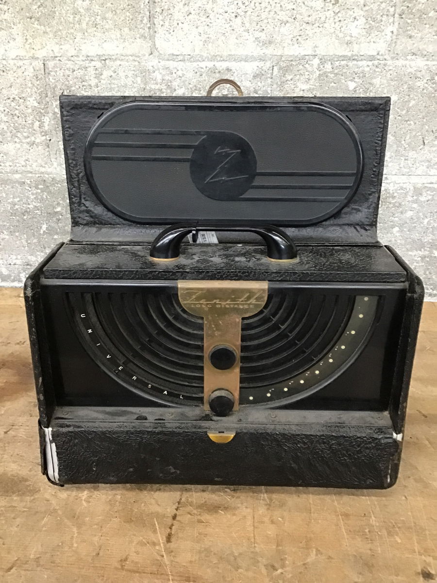 A stylish art deco radio made by Zenith circa 1946! This is the AM-only broadcast model No.6G001Y, and here's a page where you can read about it if you like that sorta thing! This unit came on when we plugged it in and caught just a teeeeny bit of static after warming up for a minute. It's in a good starting place for a restoration project! The case is a little rough, with a bald spot on the front lower left corner, and the back panel needs its hinges reattached.
