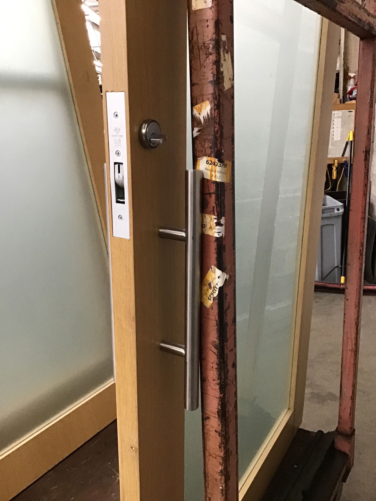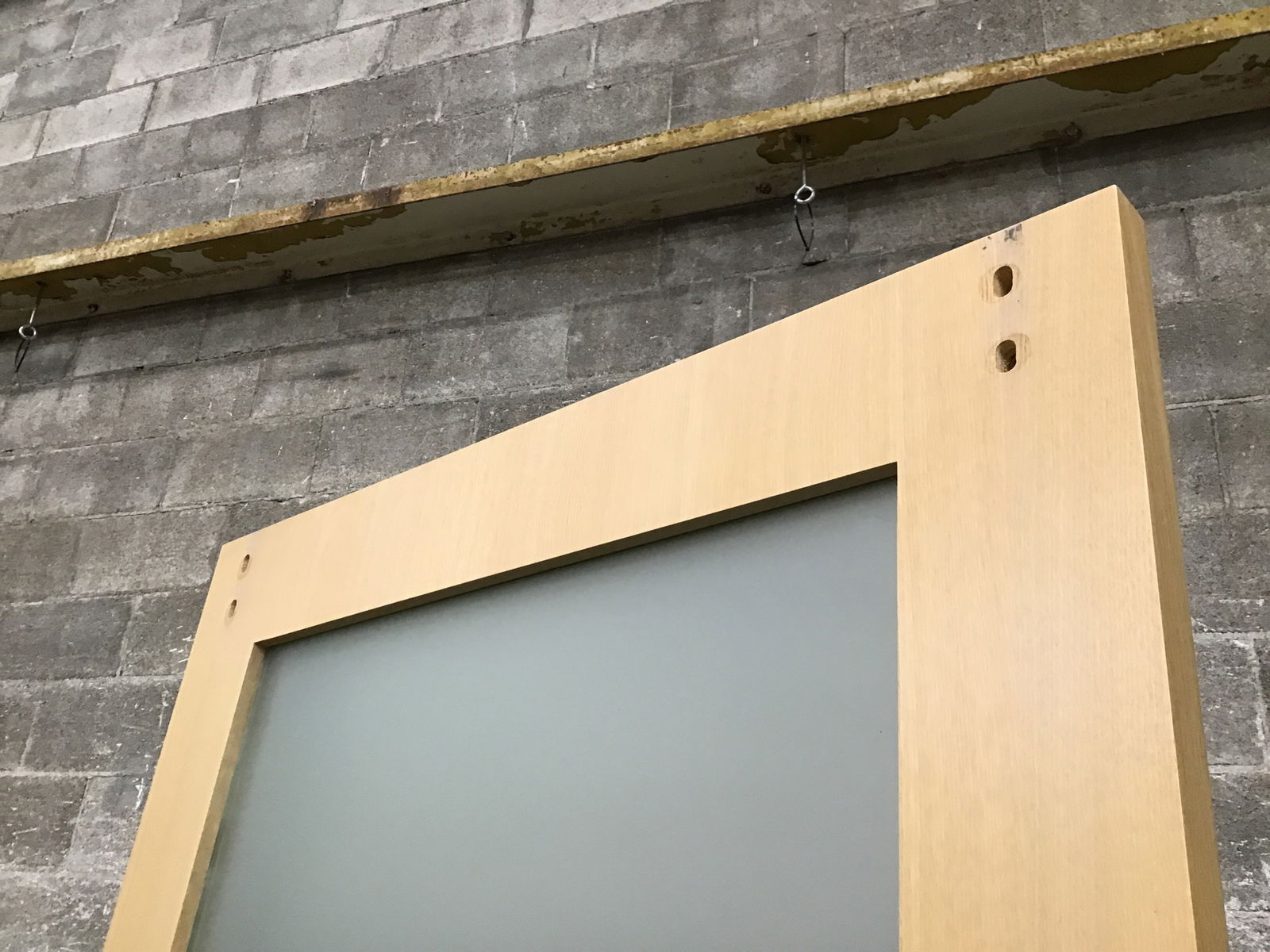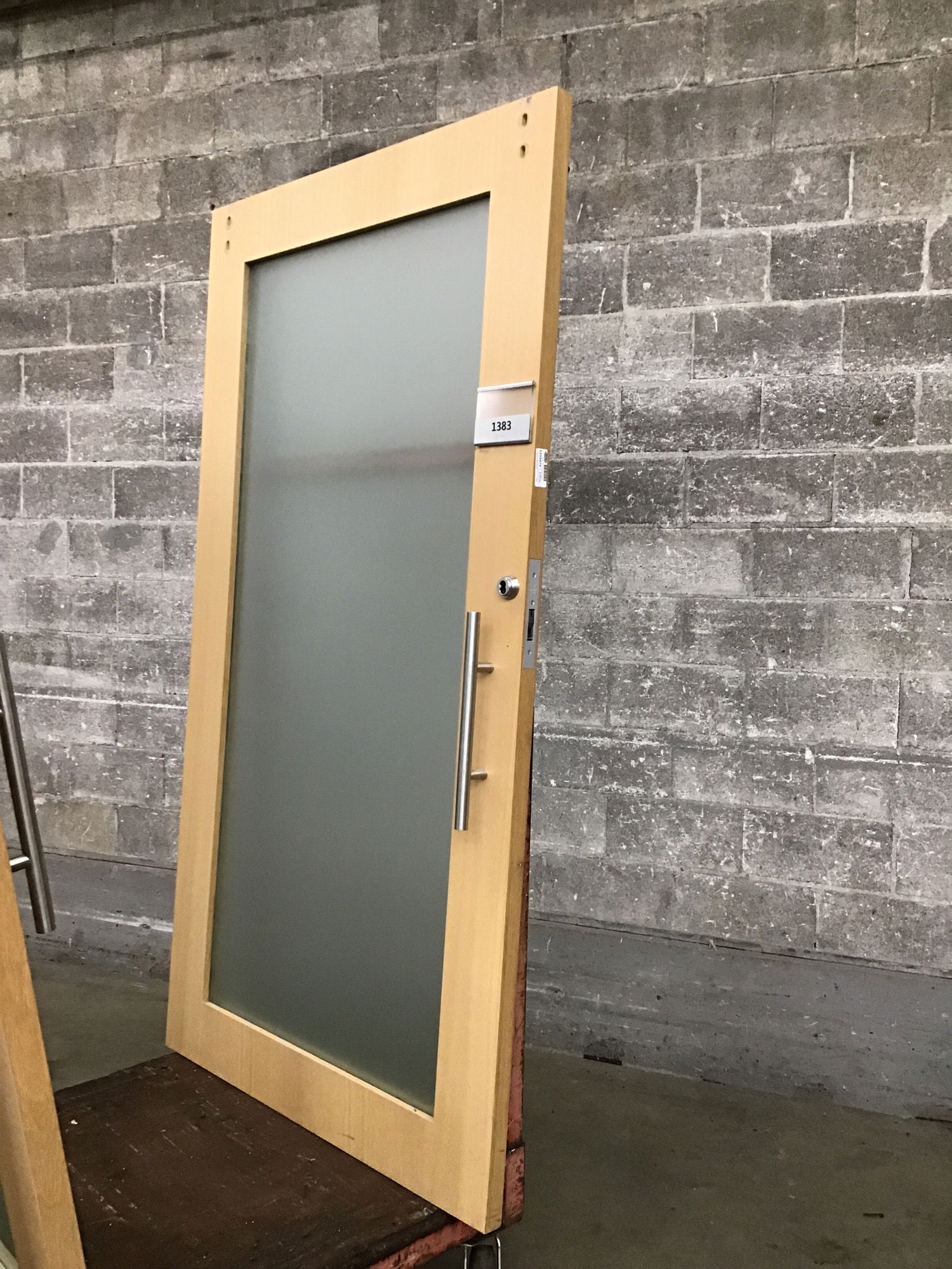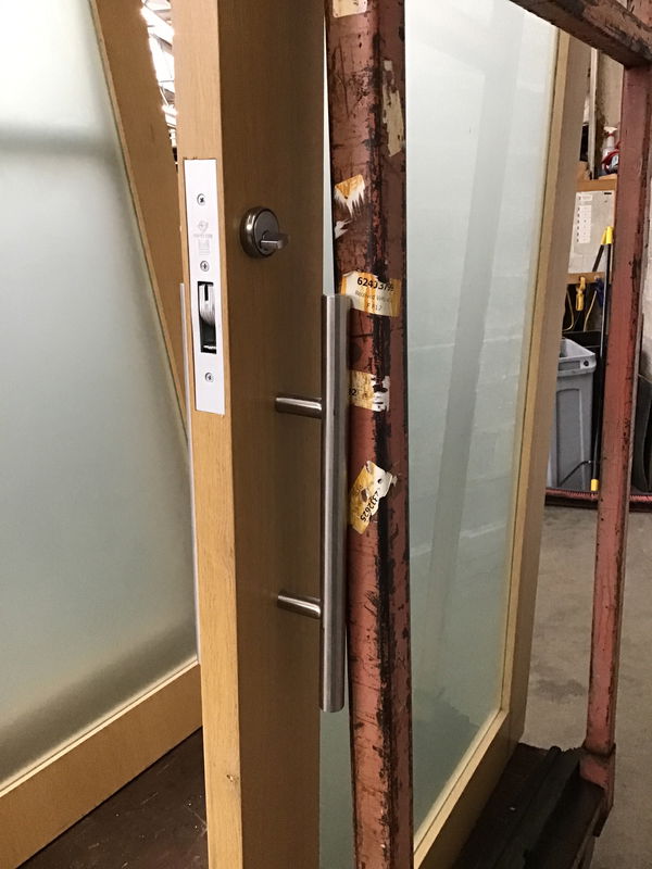 Very high quality White Oak interior door that was salvaged from a high end office space. This door has no hinge cuts as it was formerly a barn door, though no hanging hardware is included. Has a frosted film on it but you could peal it off to have it be clear. Includes stainless steel hardware. Has latch mortise installed but no keys, you could have the tumbler replaced if desired. Photo may be representational. This is a bulk item. No holds please.