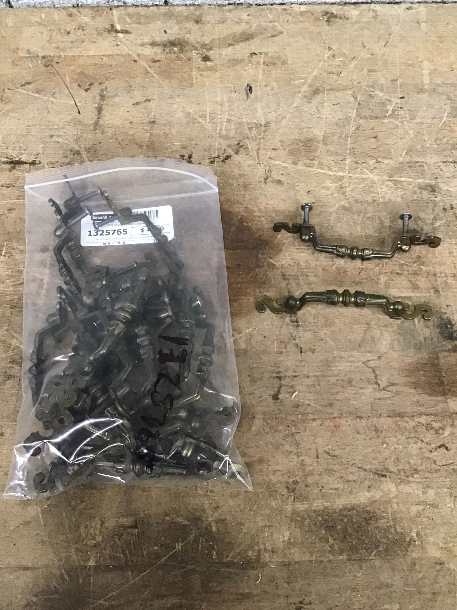Set of twenty nicely aged brass cabinet pulls with a swirly S on either side. Most have screws. There are enough here to swap out your whole kitchen!! 3" on center.