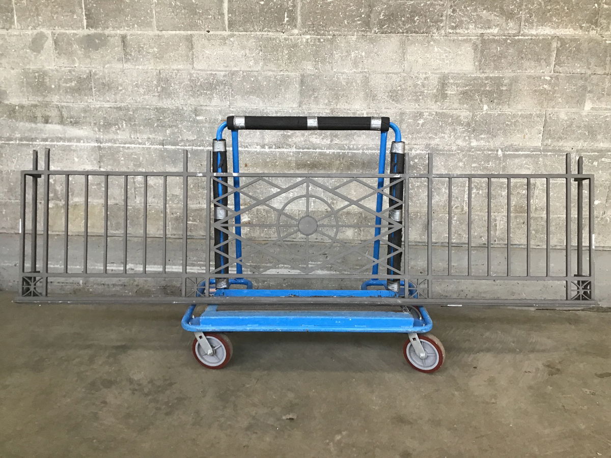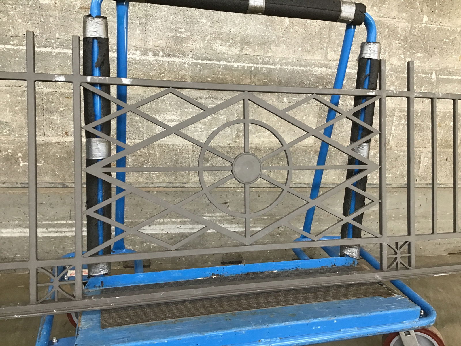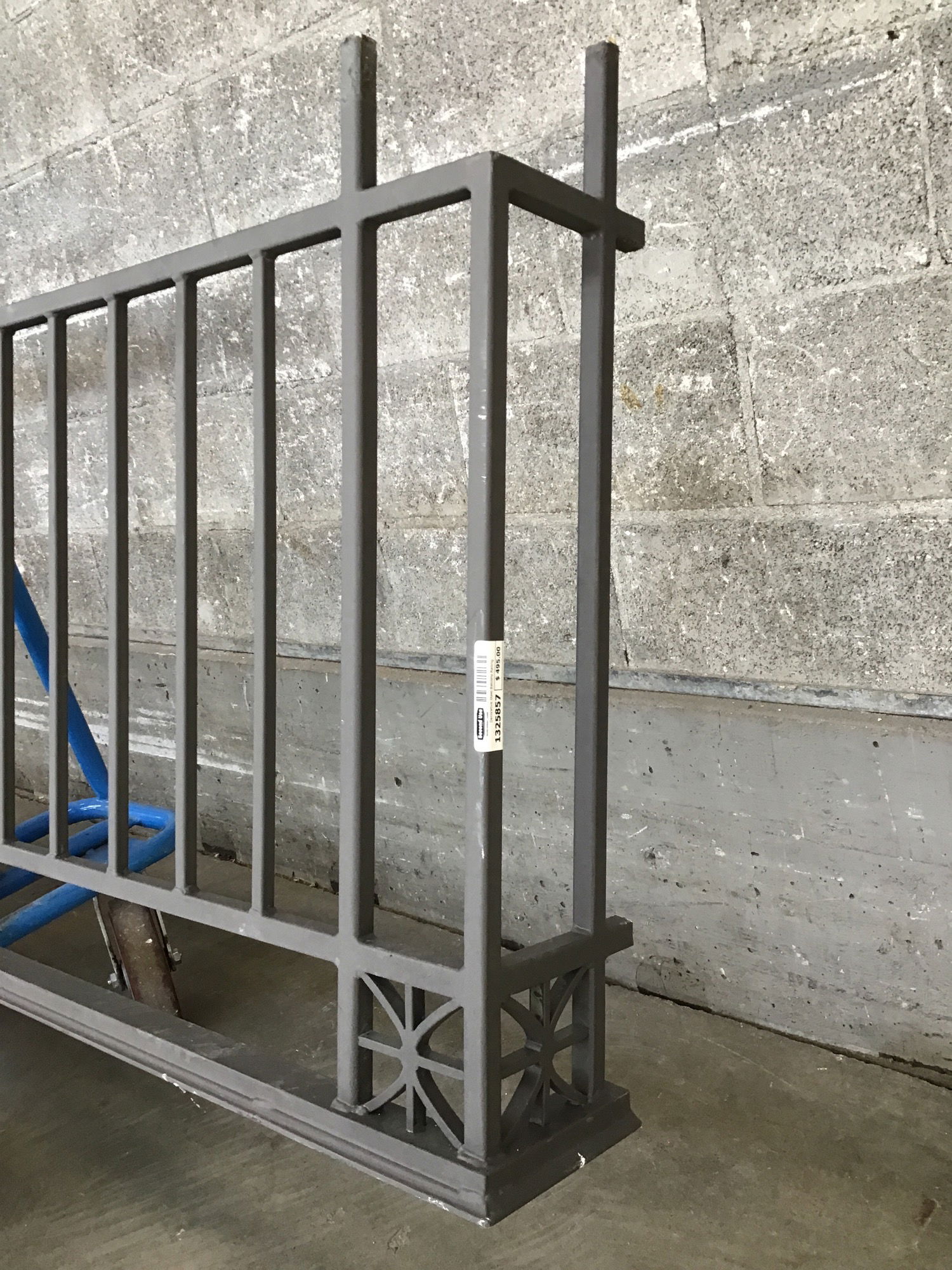 This symmetrical run of hearty steel railing is just plain cool. It's got a crazy geometric design at its center with small star-like accents along the top rail. There are returns (7.75") on either side, making it a great candidate for a shallow balcony railing. And with baluster spacing just over 3.5", this baby's up to code!!!
