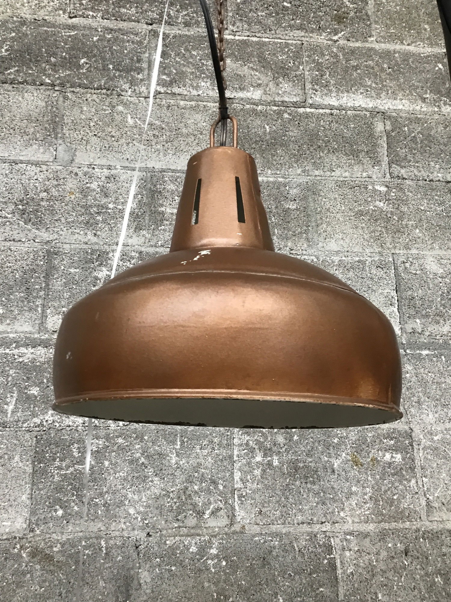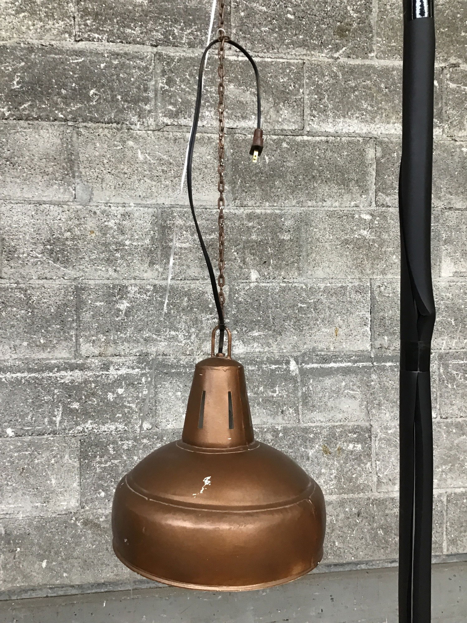 Here we have a vintage hanging light fixture with a bronze painted finish and a single bulb option. Its wiring is fixed for a wall plug and seems to be very functional when tested in house. This would look right over a pool table or gaming/activity table.