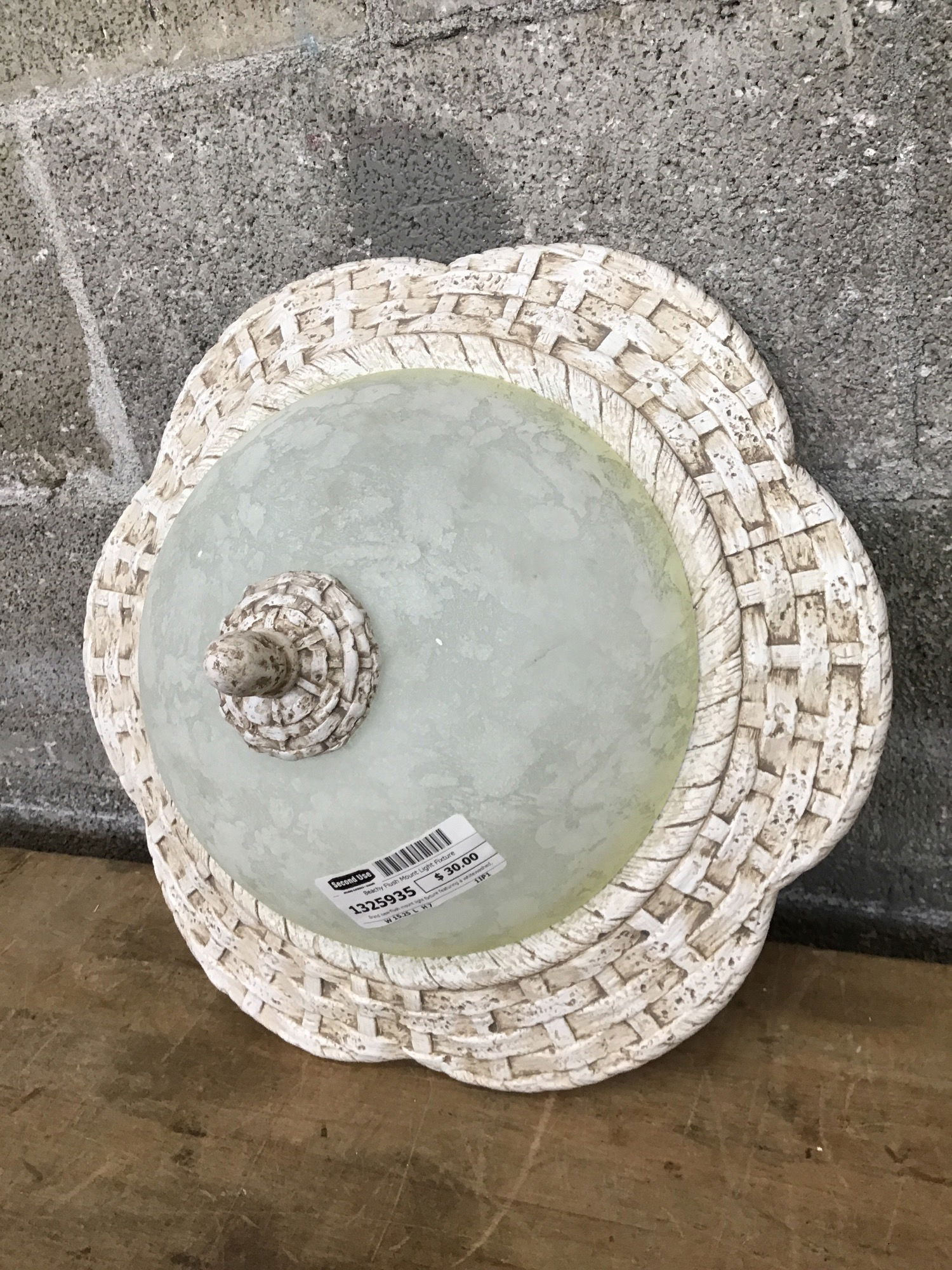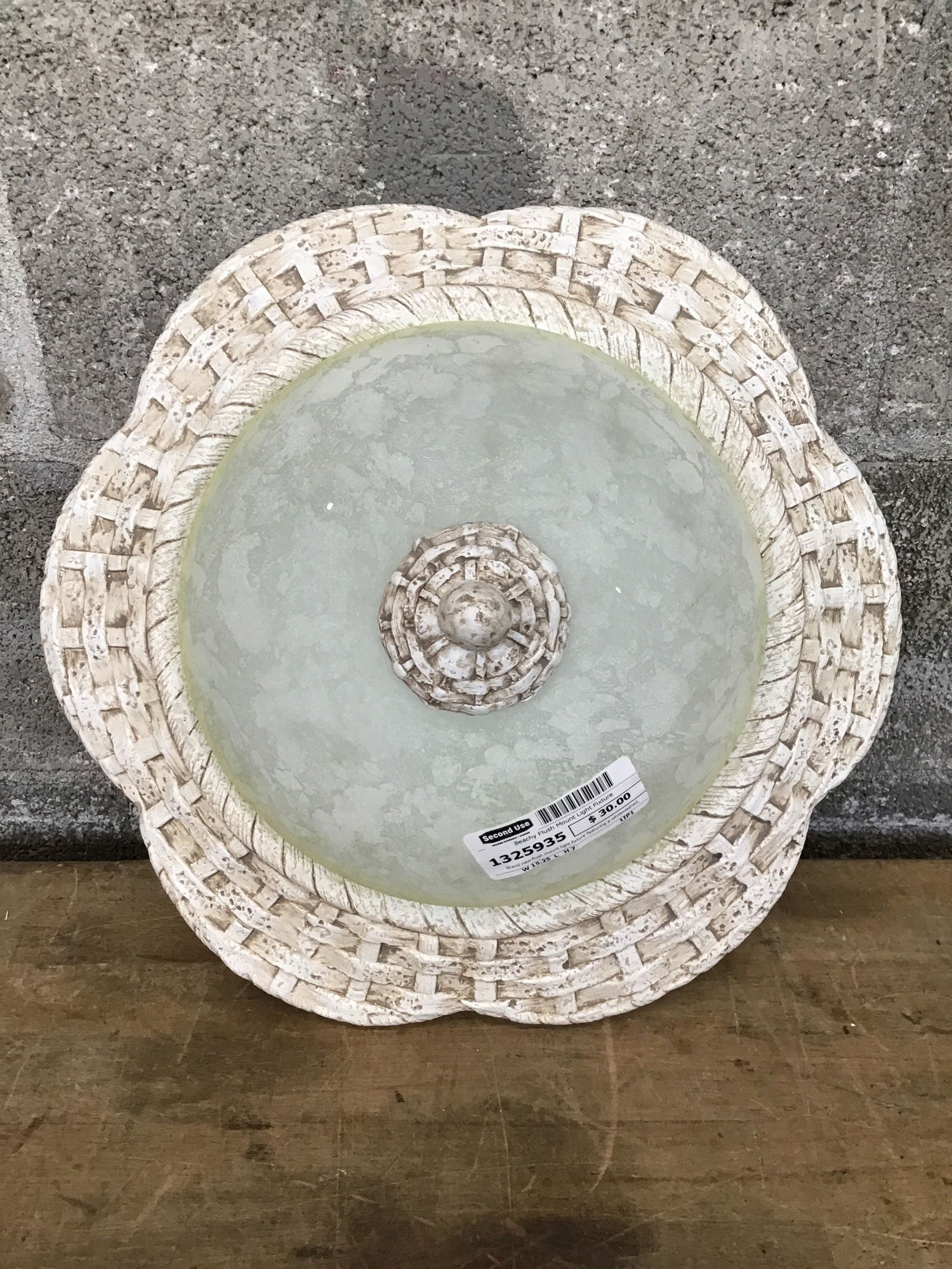 Brand new flush mount light fixture featuring a whitewashed, woven design. Tho this is a little less literal than the starfish and seashell lights, this does still have a beachy feel that would work well in a West Seattle or coastal home! Photo may be representational.