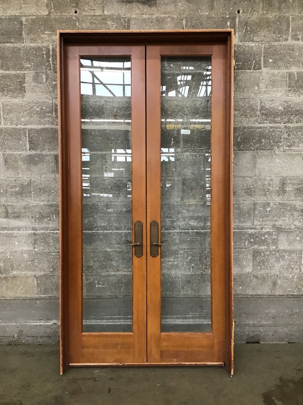 Warmly stained CVG fir full lite interior doors in a jamb for a 2x6 wall. Comes with nice quality aged brass hardware.