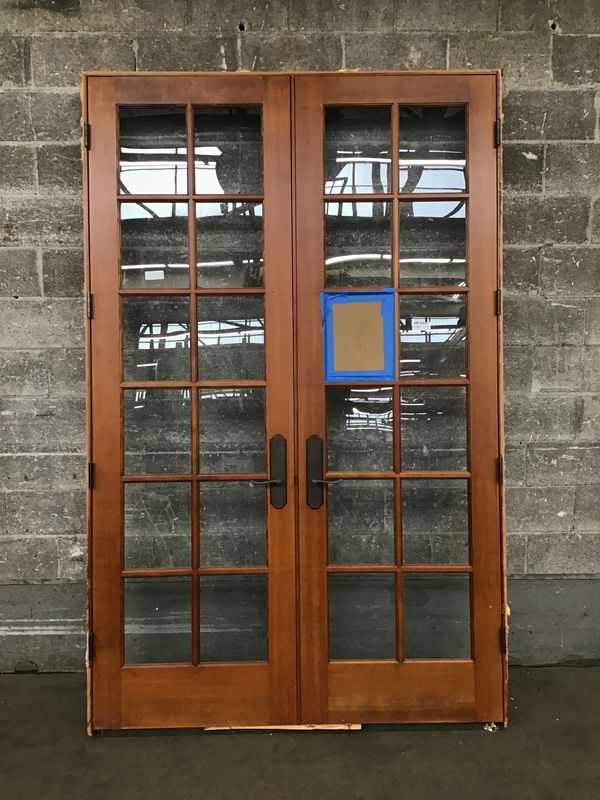 Warmly stained CVG fir twelve lite interior doors in a jamb for 2x4 wall. Comes with nice quality aged brass hardware. One pane on one of the doors has broken and has some cosmetic wear, price reflects.