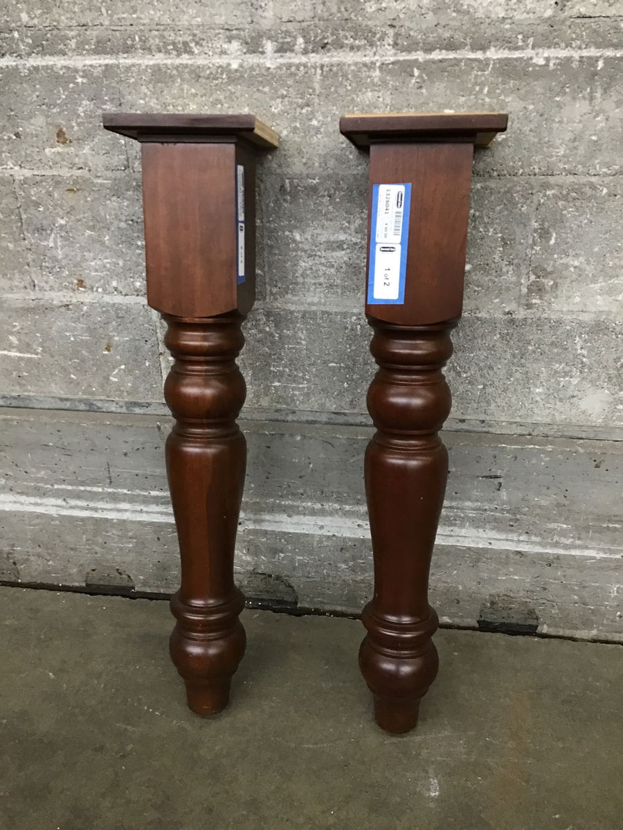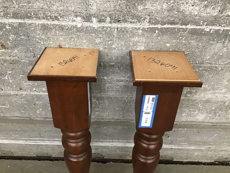 A pair of very sturdy solid wood legs in a warm brown finish that once supported a counter island. You might deploy them for that purpose, or turn them into bases for a pedestal table, newel posts, or whatever else you can cook up in your noodle!