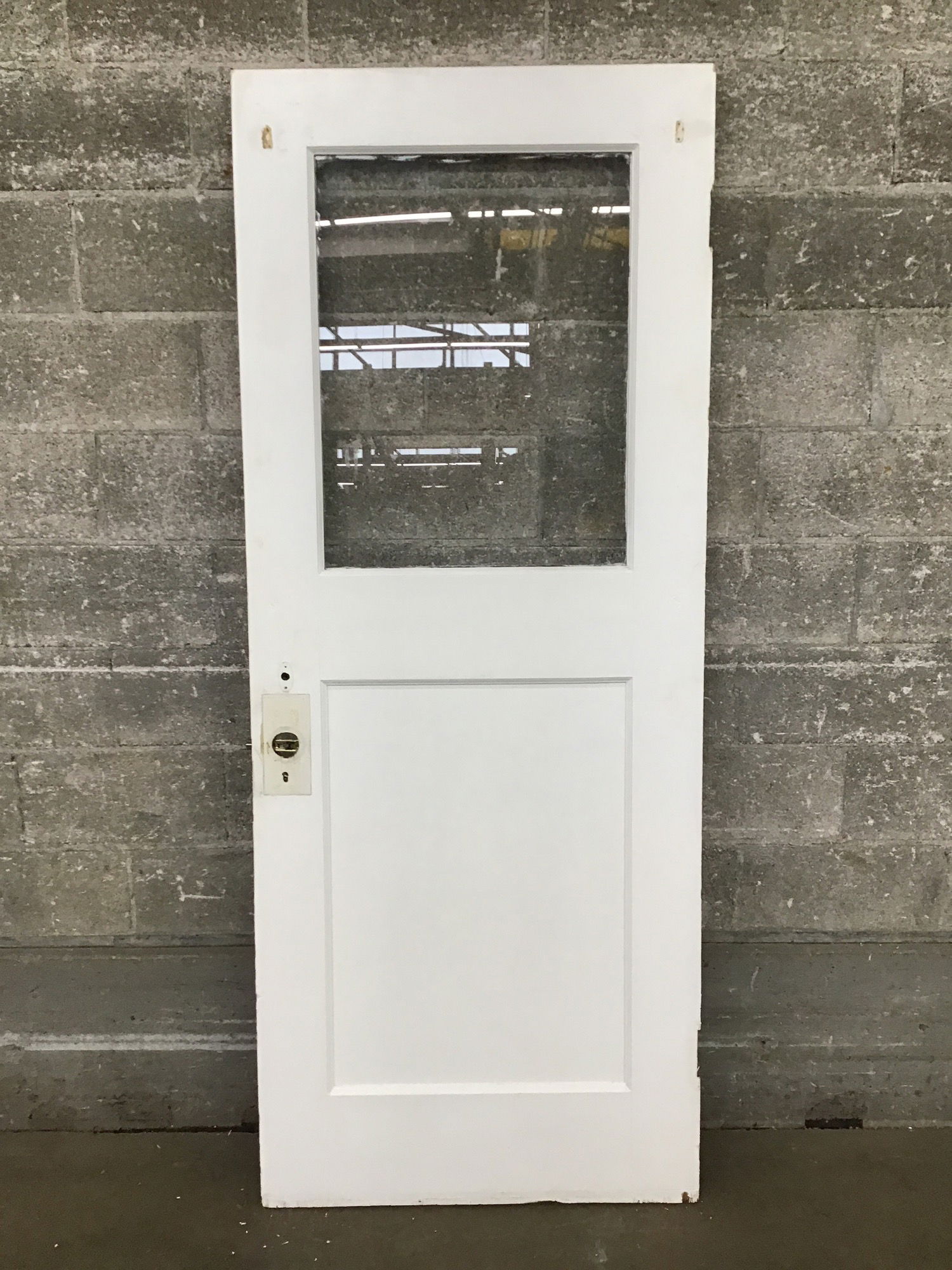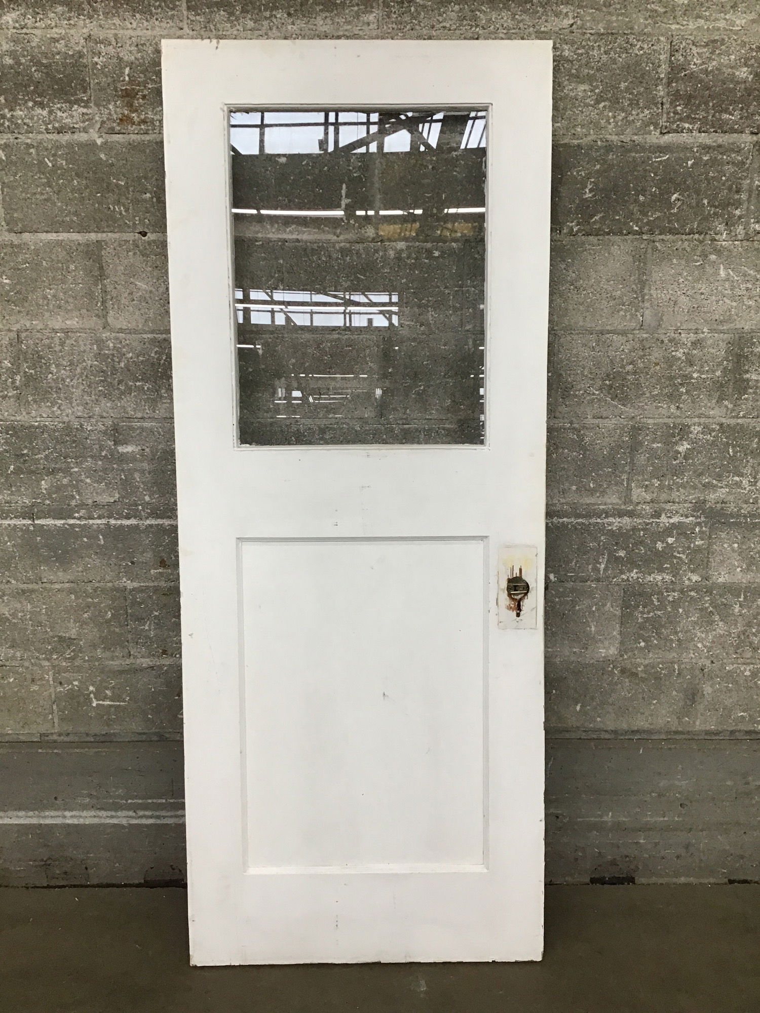 Vintage half lite door with a single pane of wavy glass and a white painted finish on both sides. There is some damage around the knob hole, which the previous owner covered with an extra large escutcheon.