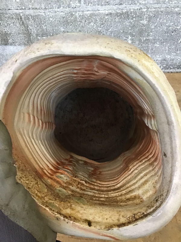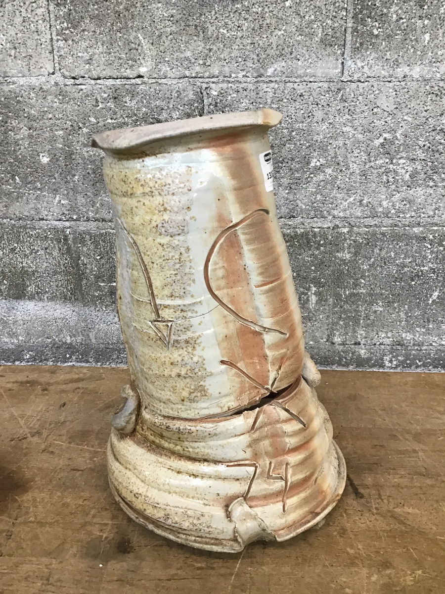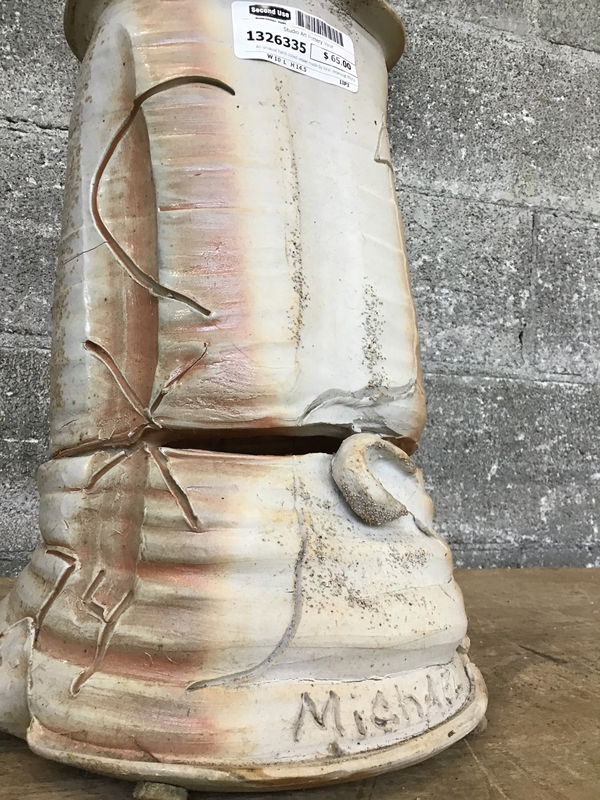 An unusual hand-coiled vessel made by local ceramicist Michael McCullough (1957-2012). This piece looks to be ash glazed, stoneware crerated by high heat. It has a soft white glaze that gives way to tan streaks and greenish-gryish speckles. It's reminiscent of the artist's "Story Jar" series, featuring deep finger ridges and graffito that invites the viewer to touch and become part of the story. The inside almost looks alive, with tonal glaze and drips that suggest the ridges of a spine or something organ-like - an anthropomorphic effect strengthened by a large opening in the coils near the base! The piece was signed by its very skilled maker, a Washington native and longtime ceramics instructor, in 2010.