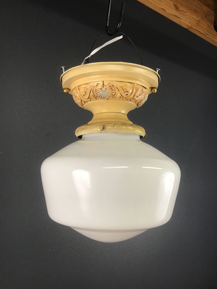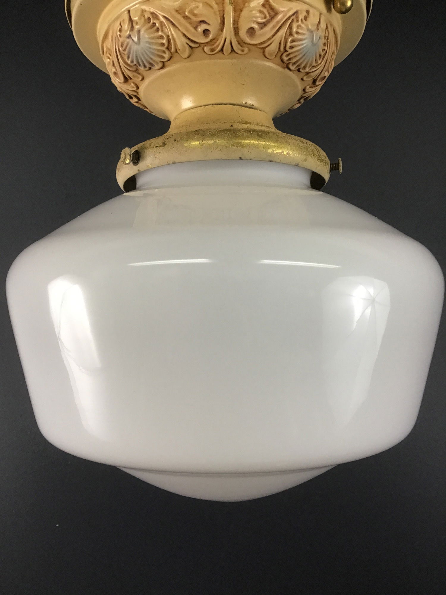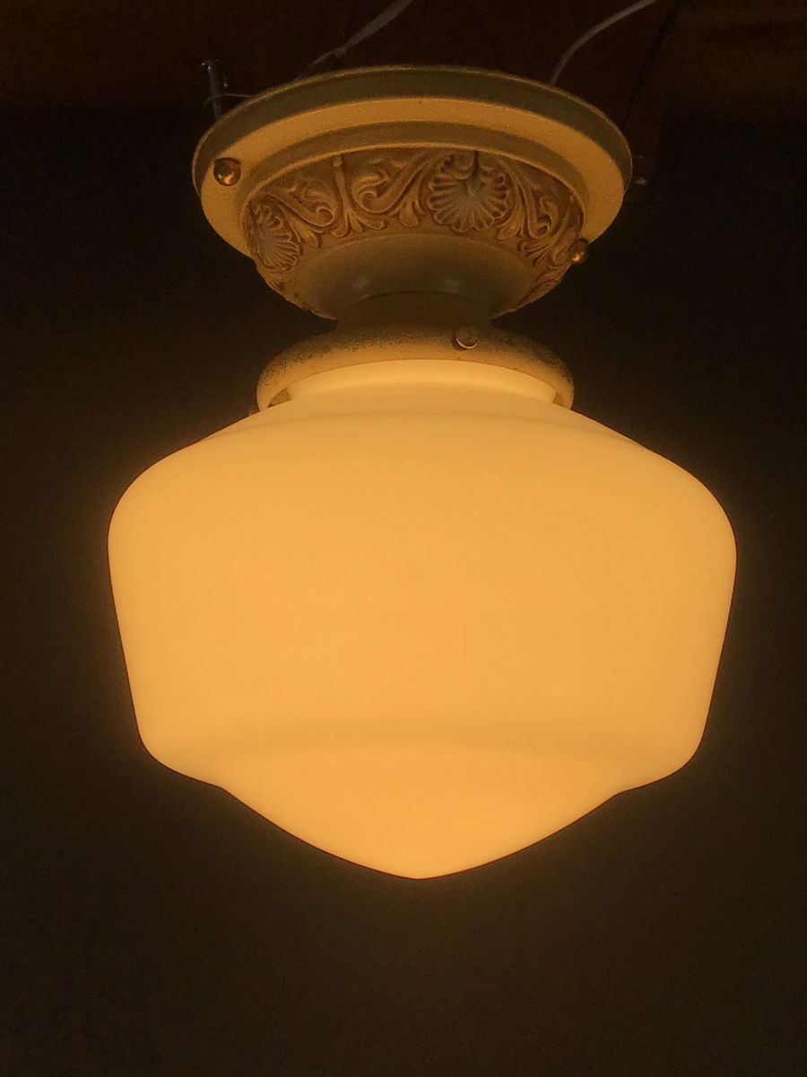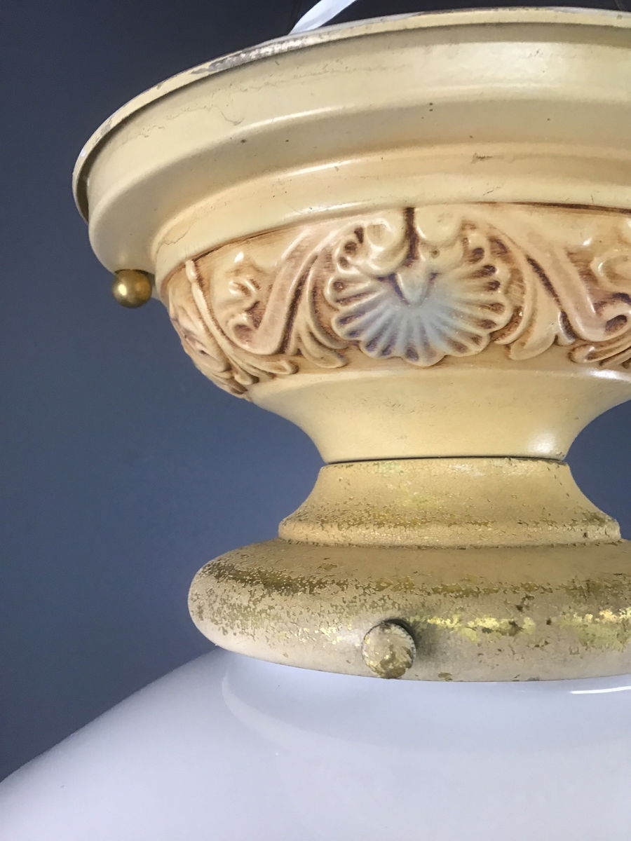 This ceiling fixture includes original polychrome paint and white schoolhouse globes. The lightshop has rewired the fixture, using a two part ceramic socket.