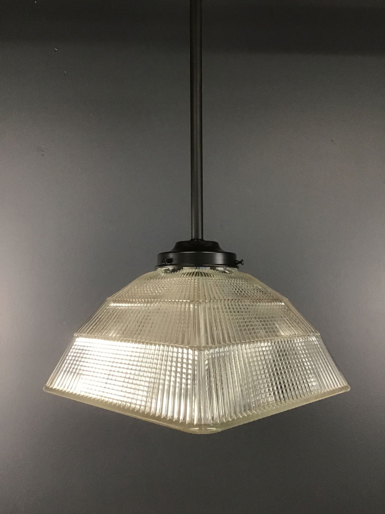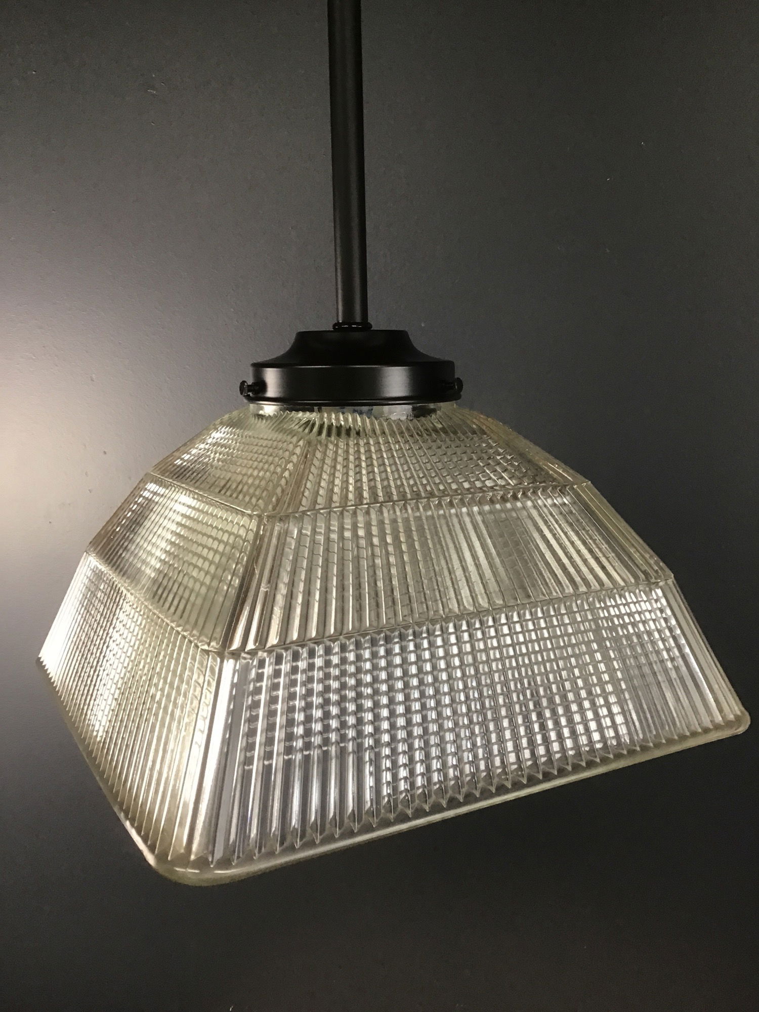 A cool black post pendant light made from vintage and new parts, including a Holophane 3779 square shade! We have many more of these shades if you want rto make your own style of light! This one was built in our on site light repair workshop