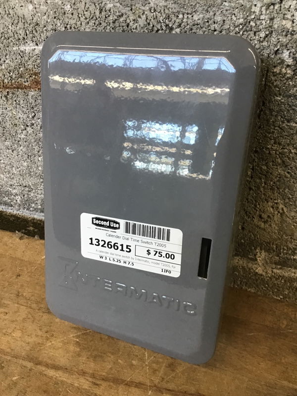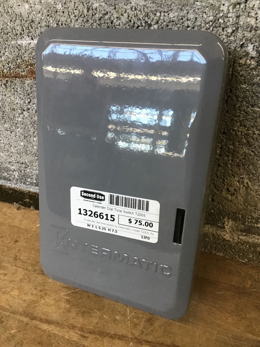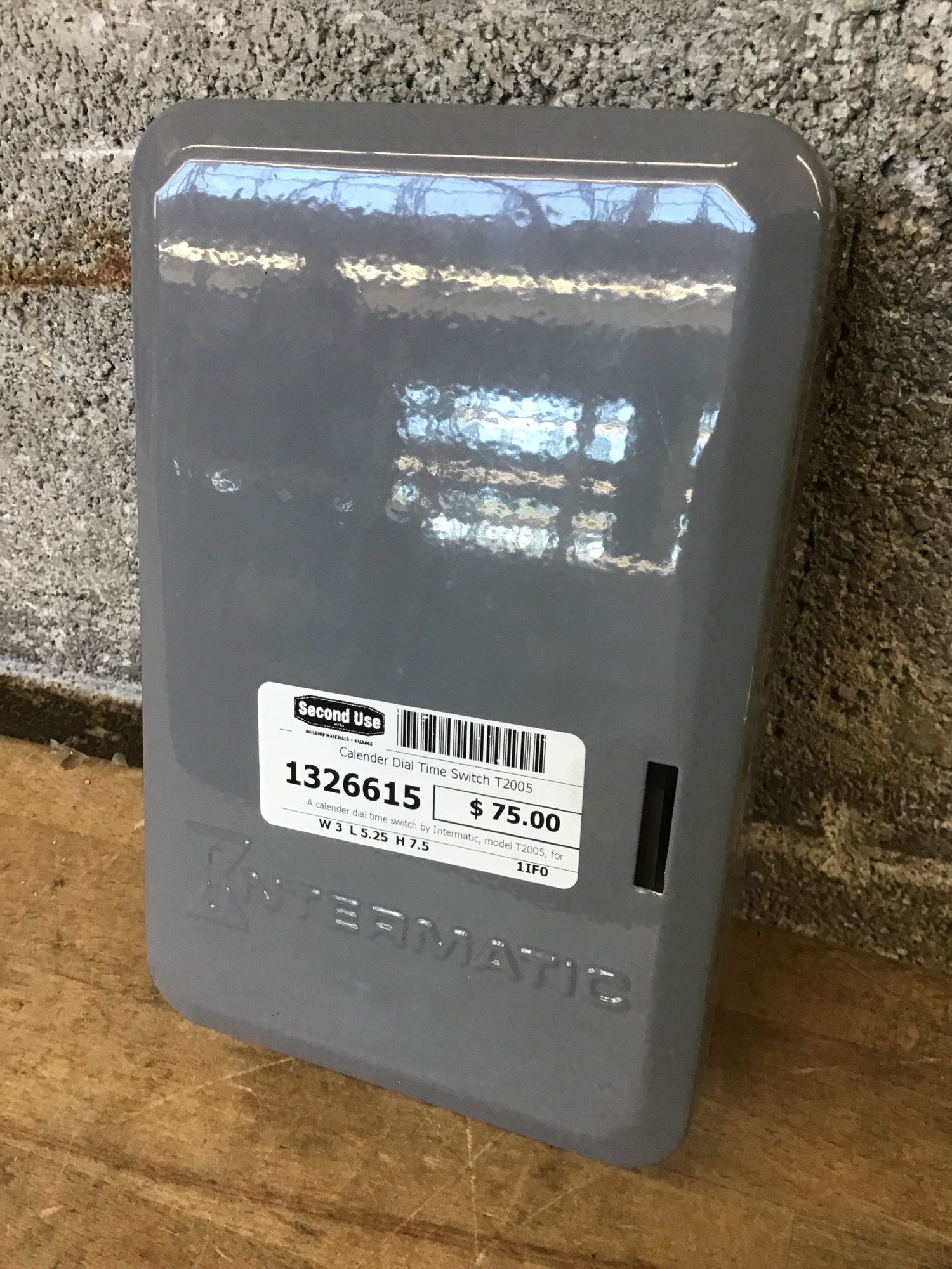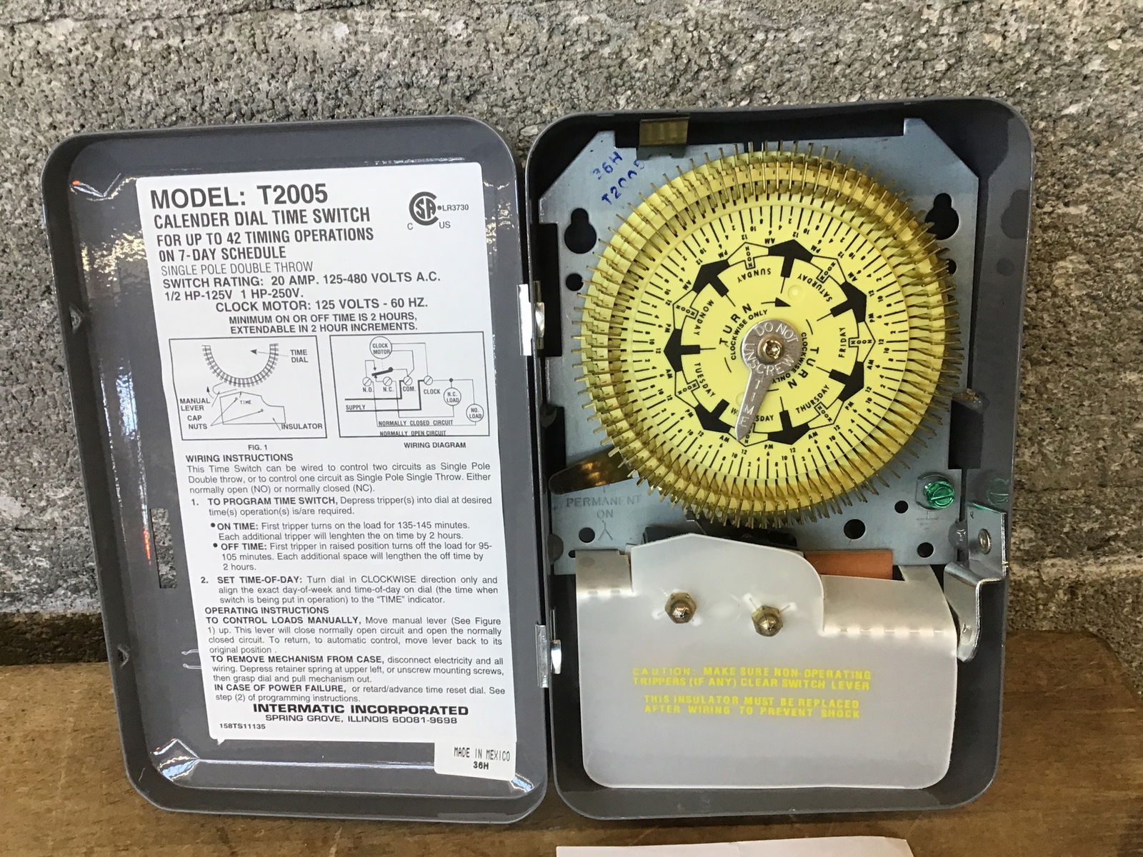 A calendar dial time switch by Intermatic, model T2005, for up to 42 timing operations on a 7 day schedule. Untested in house but looks in good shape. This model retails new at $290.00.
