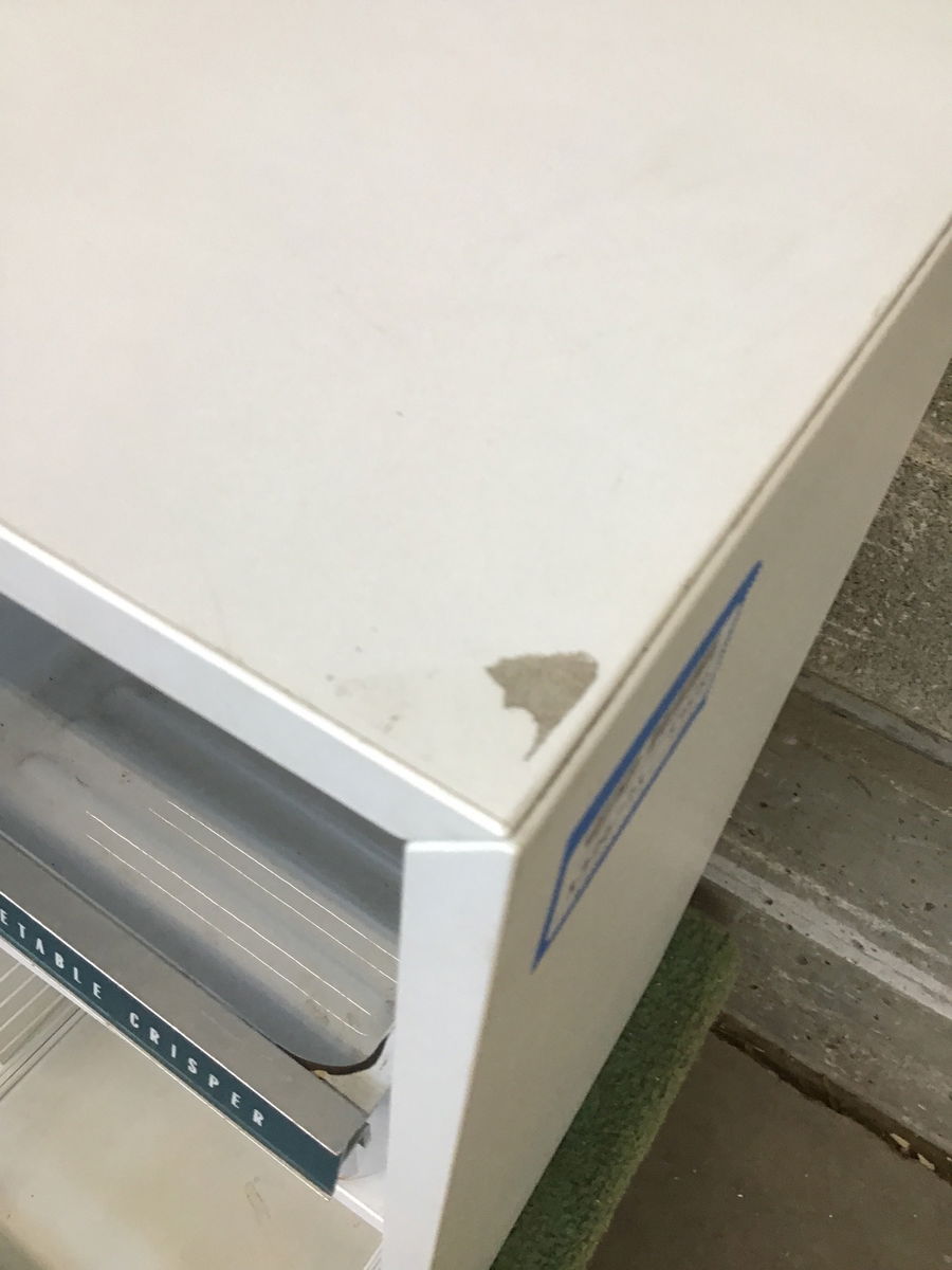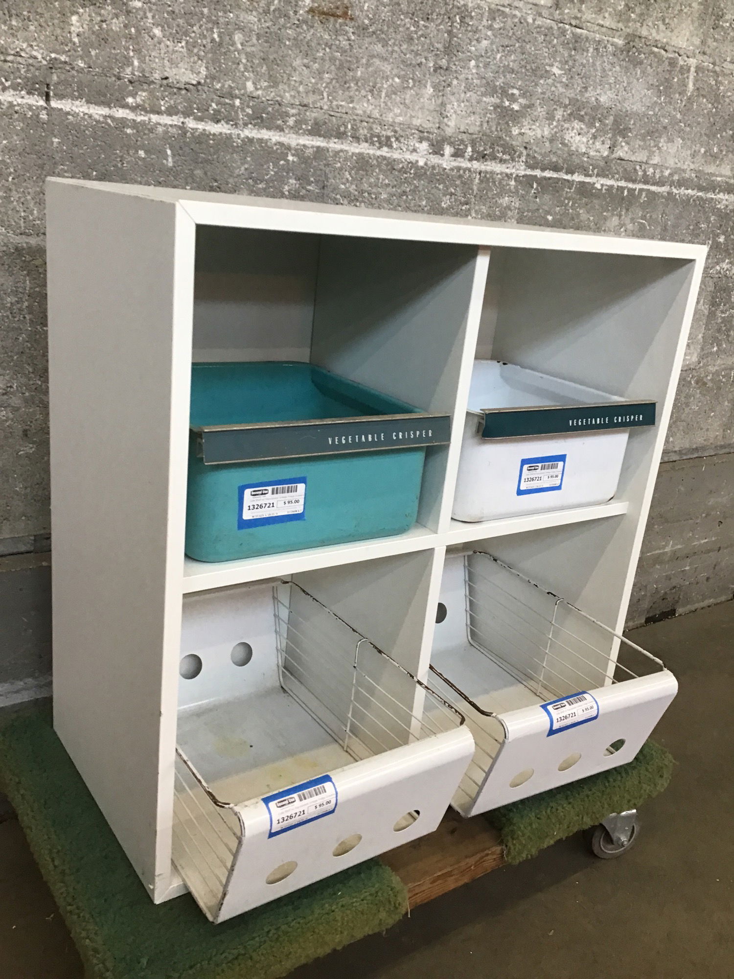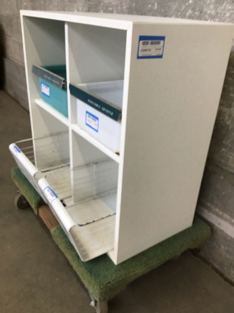 Small white partical board shelf with cube compartments. There have been four vintage steel refrigerator drawers or baskets repurposed to give it some TOTAL cuteness. Length listed is with the deepest drawers on the bottom sticking out. There's a little mar white finish at top right front corner. Price reflects.