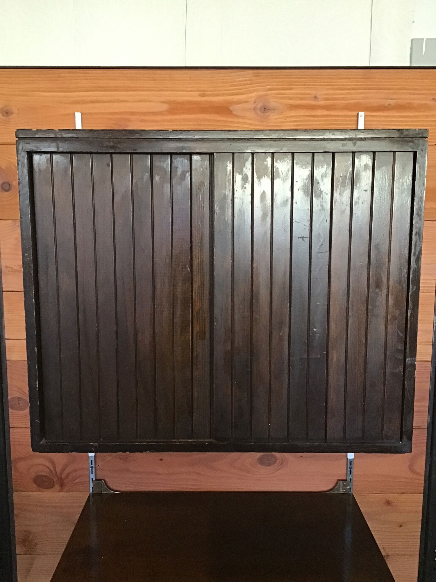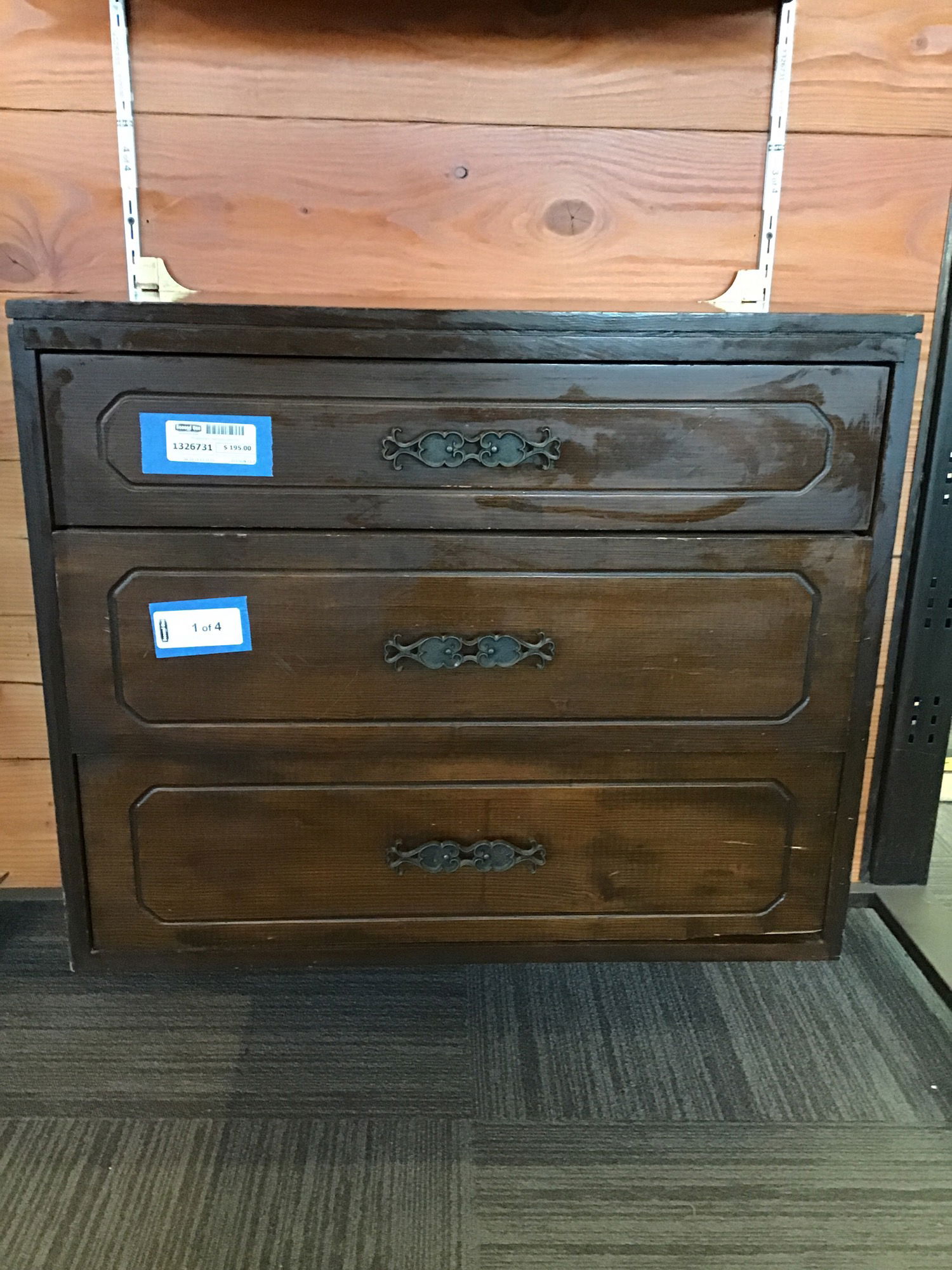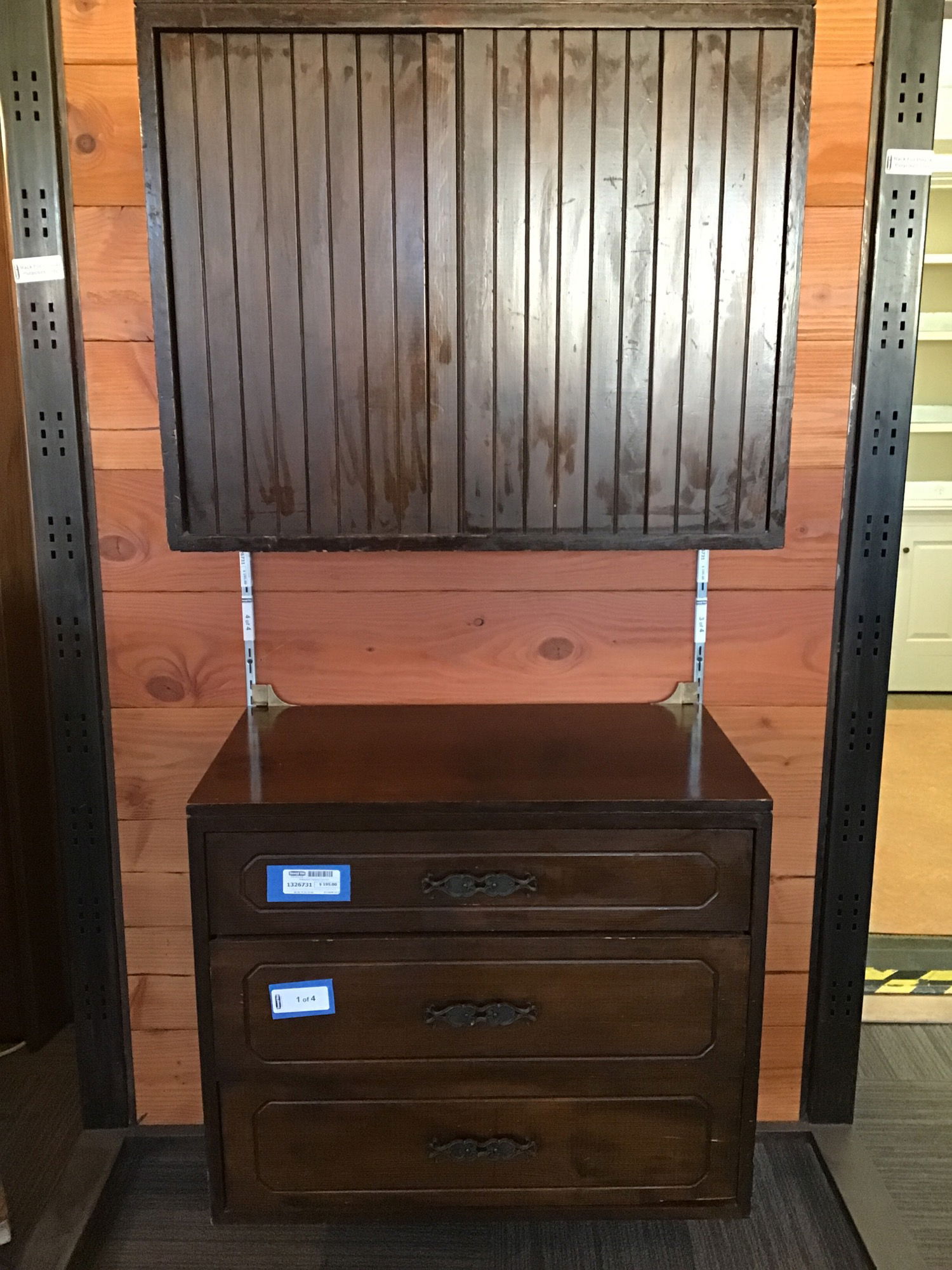 Two dark stained fir cabinets that hang from steel track like "standards" that get screwed to the wall. Both are size listed. One has two bypass doors, while the other has three drawers. Comes with the two standards they're hanging from, but the finish of the steel doesn't match the aged brass finish of the ~27 1/2" on center hooks that attach it. Looks like nothing a can of spray paint couldn't fix. Each piece does have some scratches and cosmetic wear consistent with use, but structurally sound and quite unique. I think they'd work great in a walk in closet. Made by Woodland Furniture Mfg. Inc. of Torrance, California.