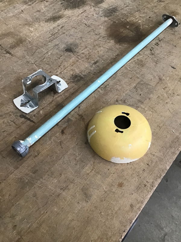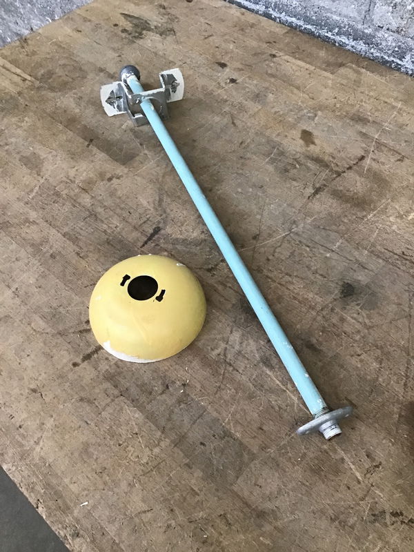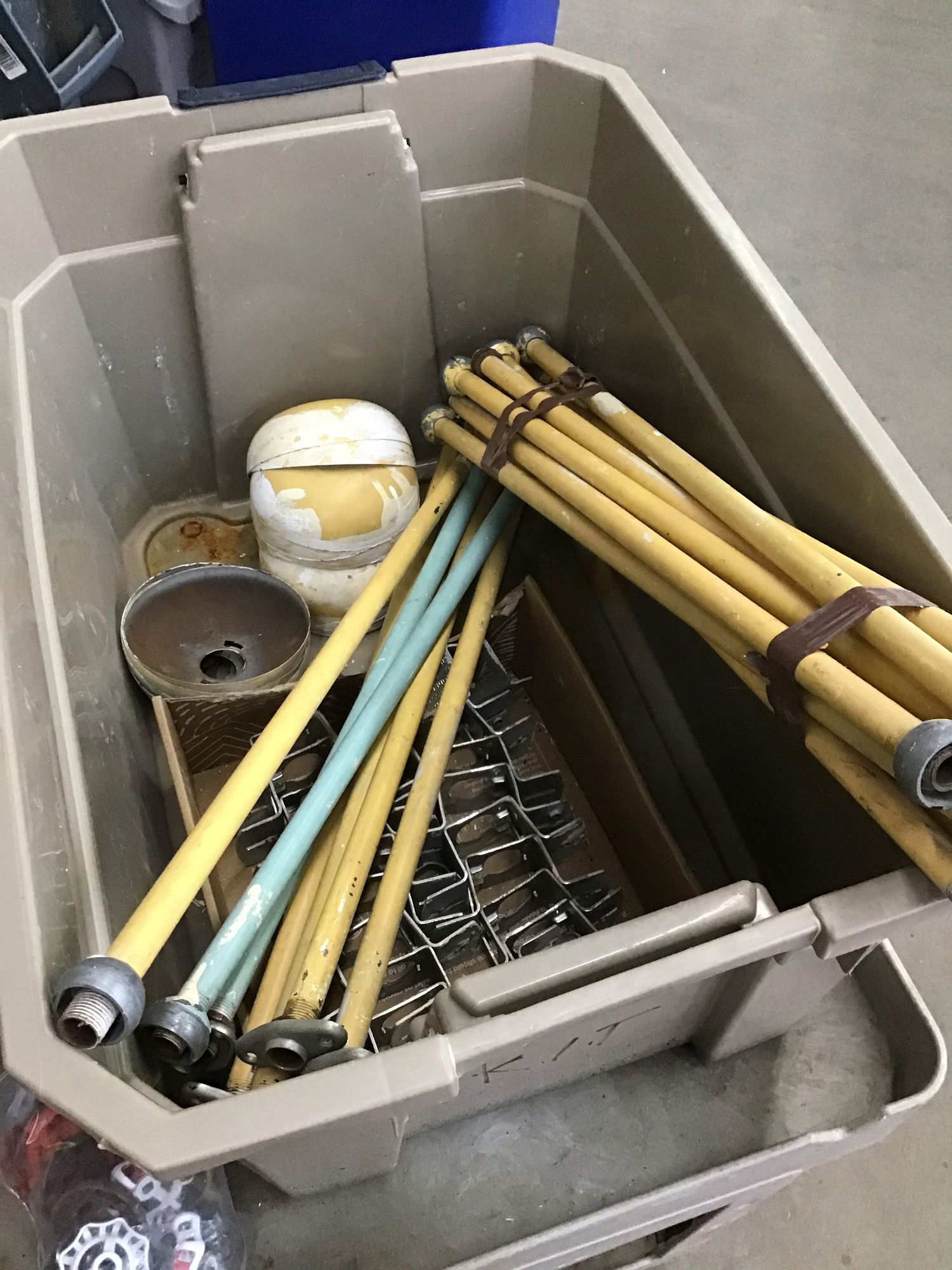 A bin of some vintage light fixture frame hardware bits. Includes about 19 metal fixture polls, 19 hanging bracket and about 16 light canopies. All but the hanging brackets are painted in a pale yellow or pale blue color.