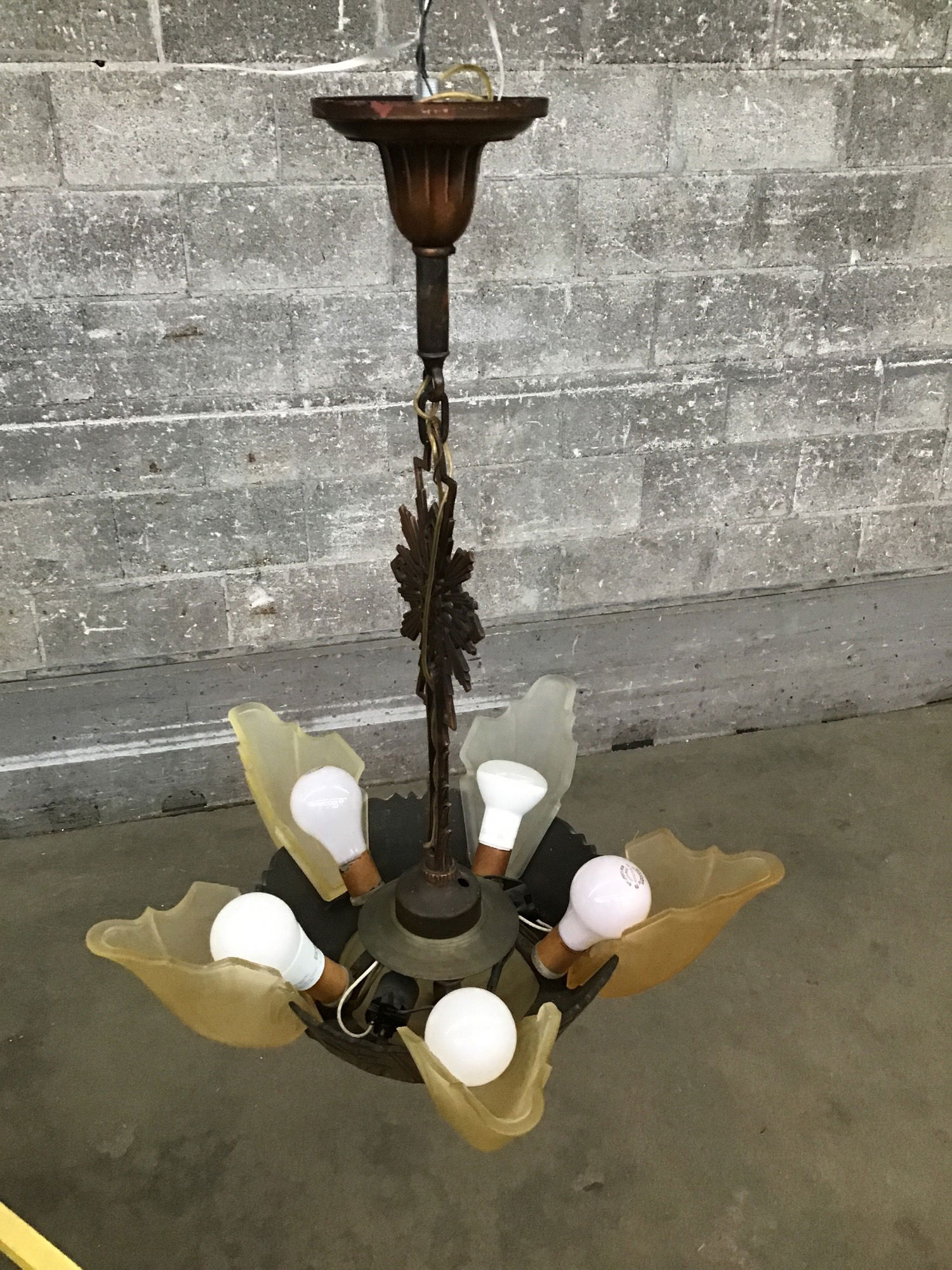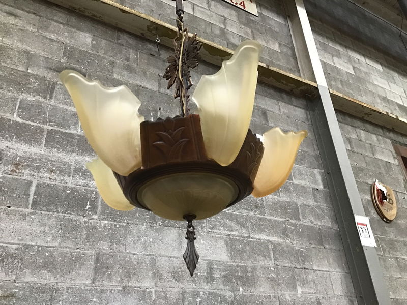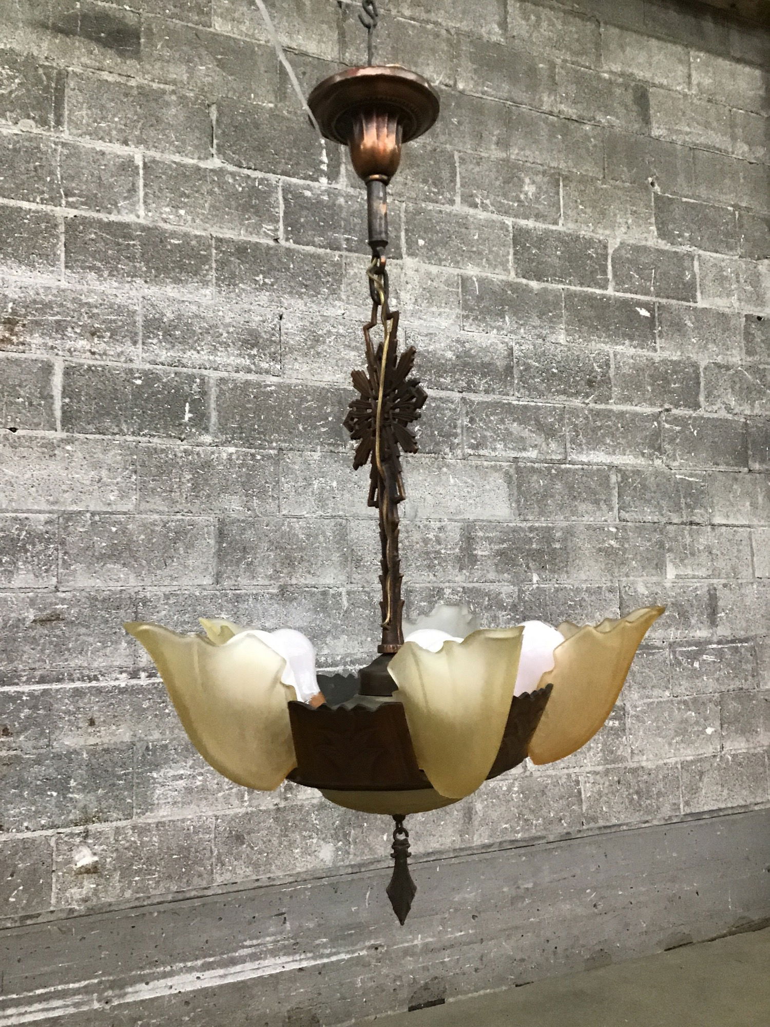 A gorgeous 5 light slip shade chandelier from the depression era with patinated copper body and 5 frosted glass bat wing-style shades and a lit dome beneath the main body! May be attributed to Lincoln. One shade was missing and has been replaced with a matching shade in a different color - you could probably do a light wash of paint to match the other shades. It looks like it's been rewired recently, so it's ready for install! If you want this stunner restored further, consider hiring our in-house light shop!
