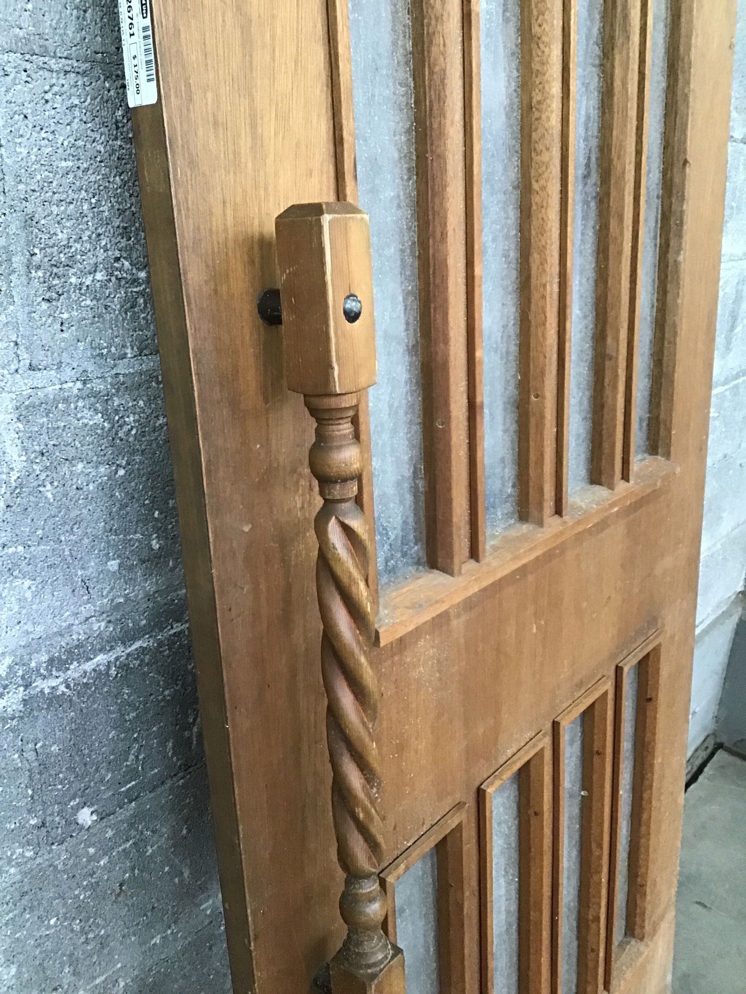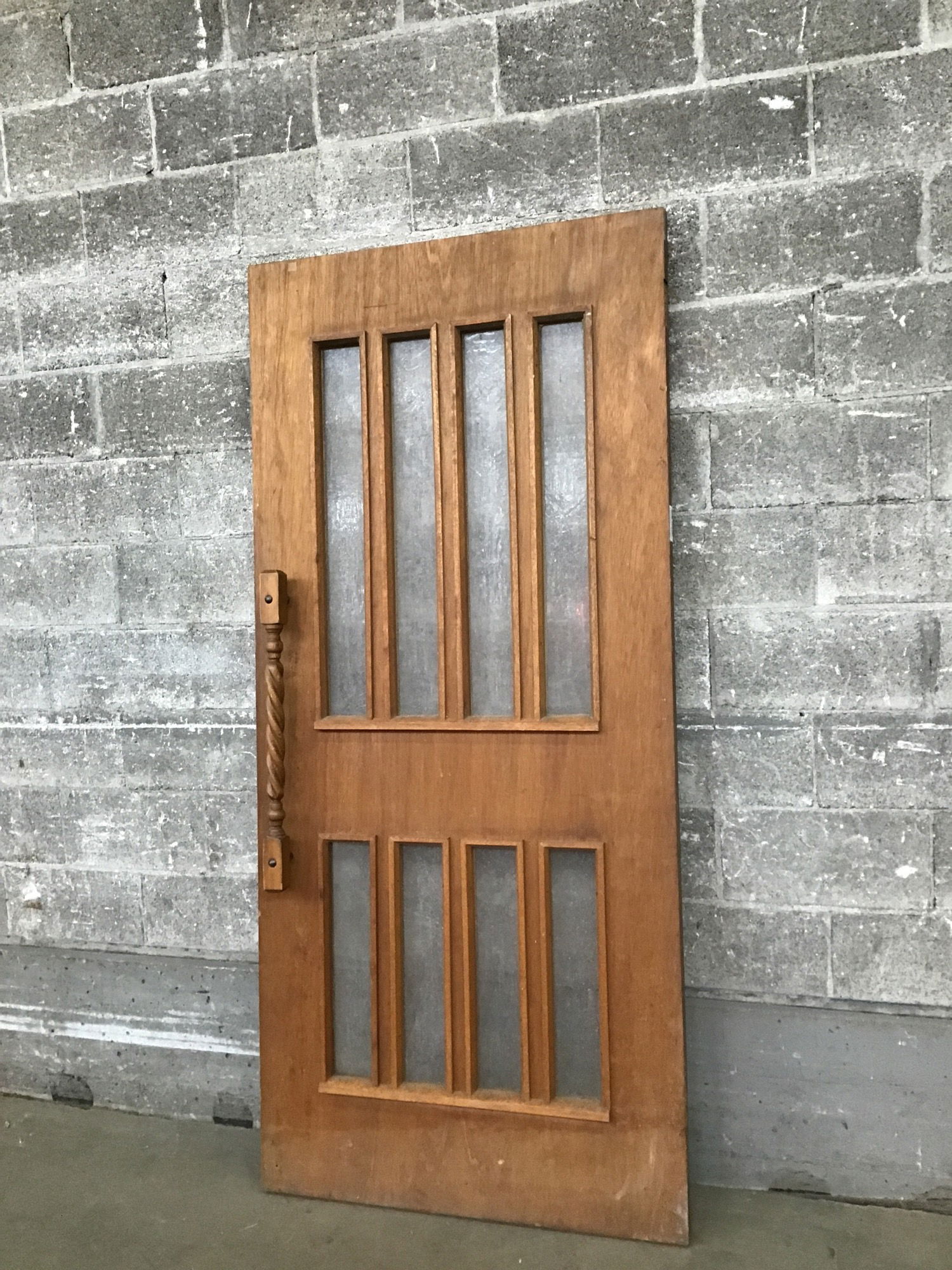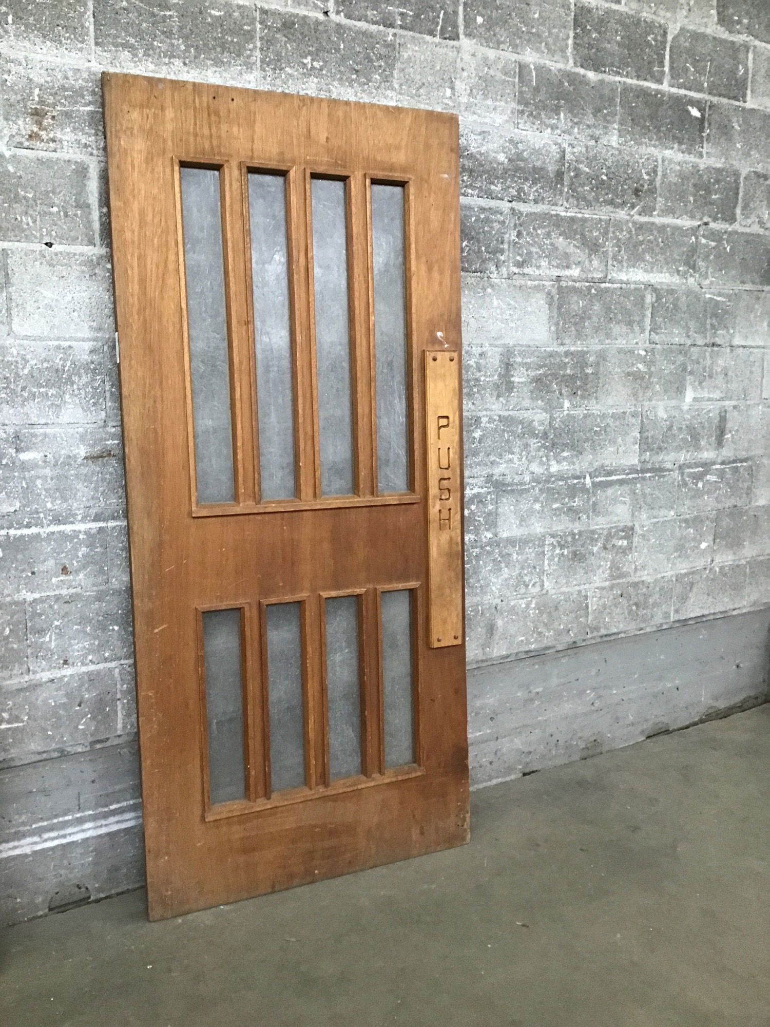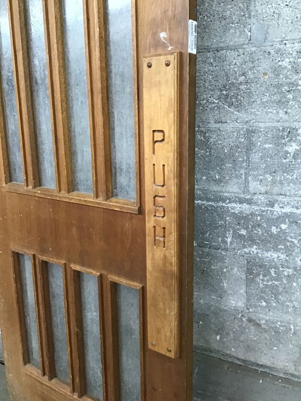 Solid core mahogany door with obscured glass installed. This one has all its glass, an original pull handle on one side and push plate on the other. Price reflects condition.