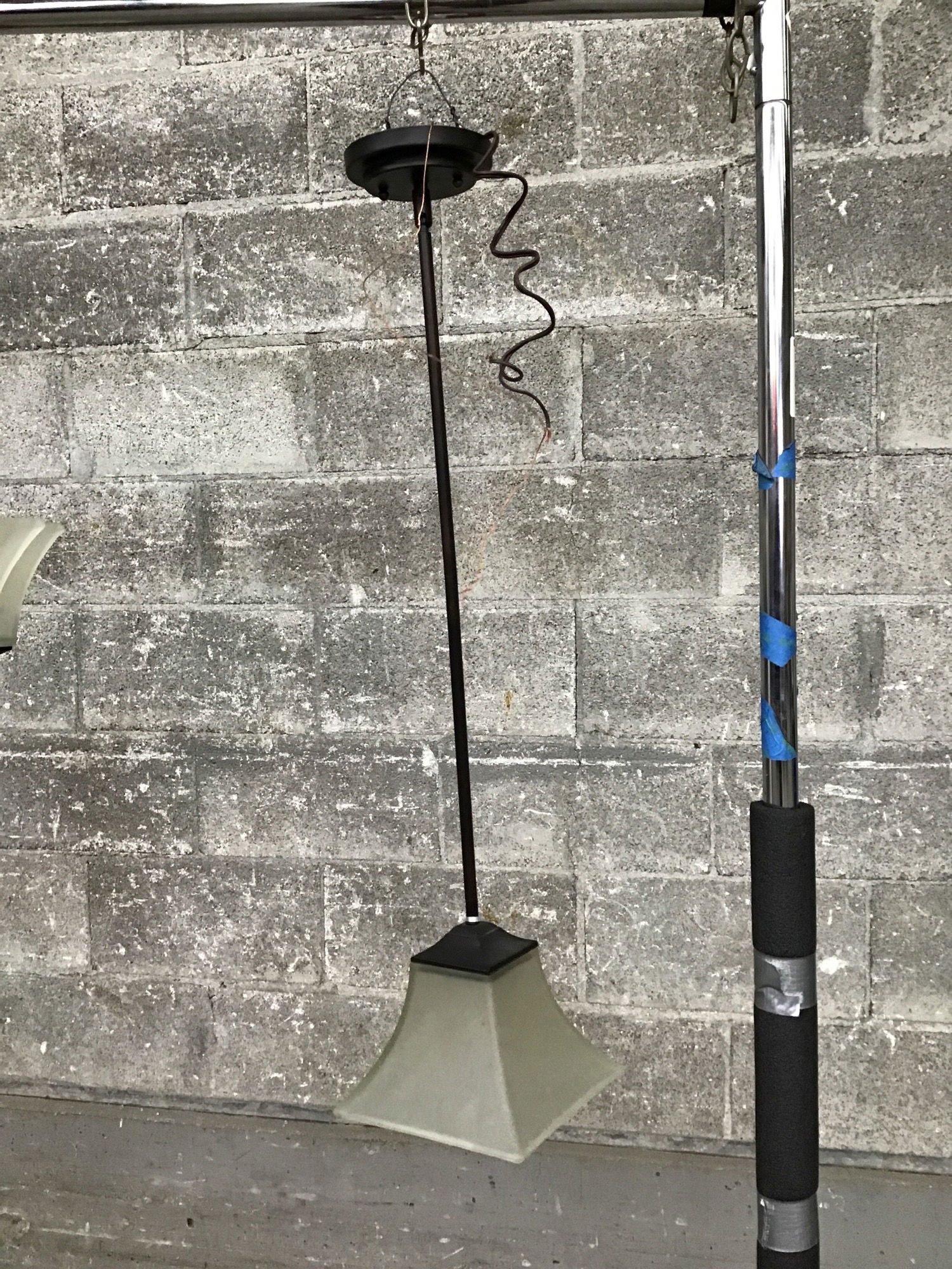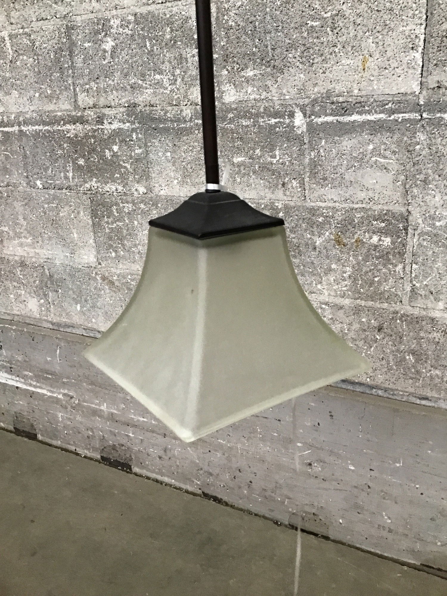 A modern pendant light fixture by Maxim Lighting, from their Aurora Line, with an oil-rubbed bronze finish to its construction and a sloped frosted glass fitter around the bulb. Retails new for about $65.