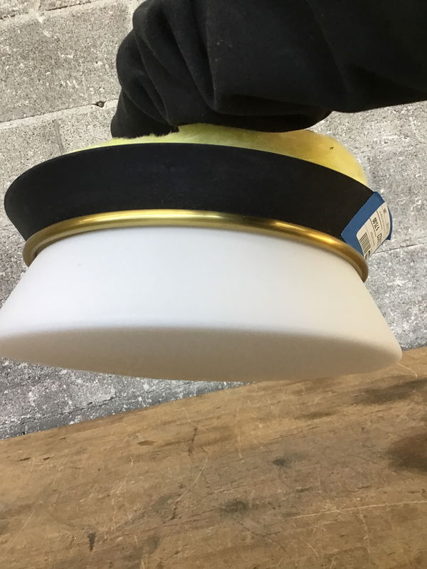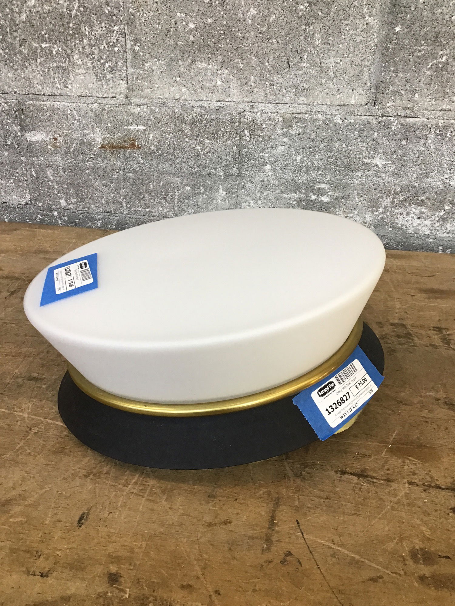 A classy flush-mount light fixture that sports an elegant white fitter over the two bulbs and a black/aged brass finish to its canopy construction. Made by Mitzi as part of their Cath line, this unit retails new for about $290.