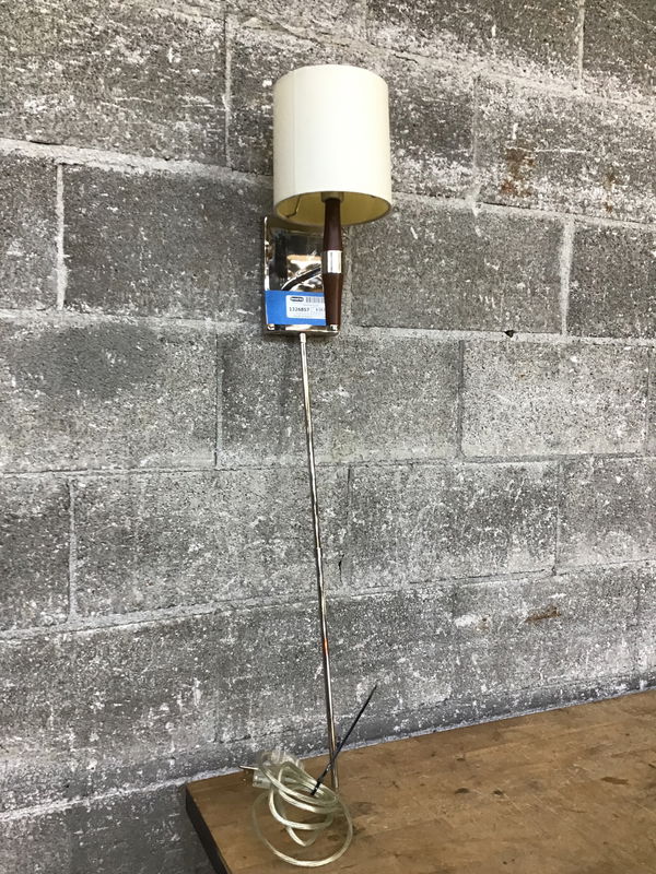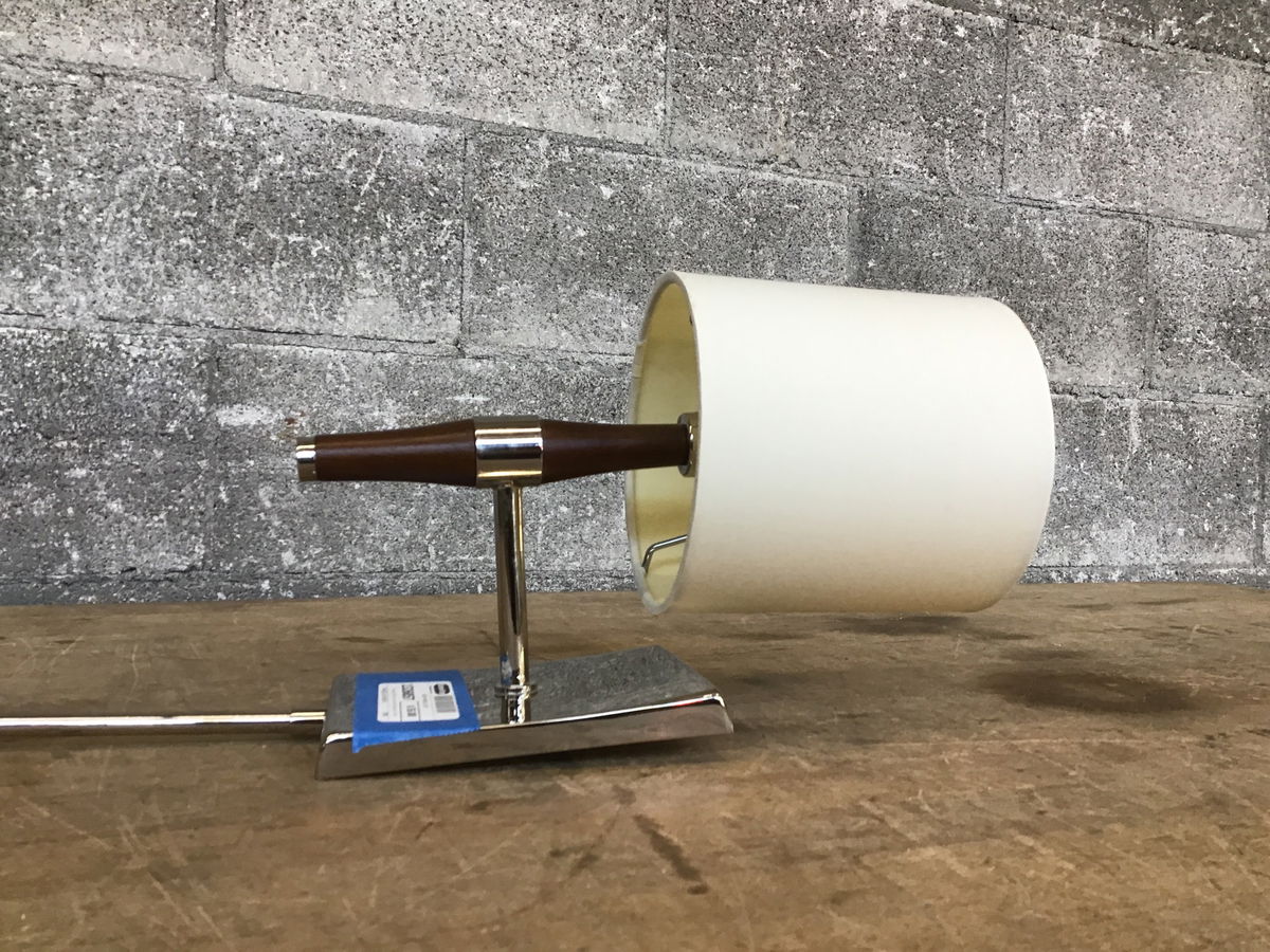 A classy light fixture like a little lamp sporting a chrome finish to its construction with wood accents and a linen lampshade.