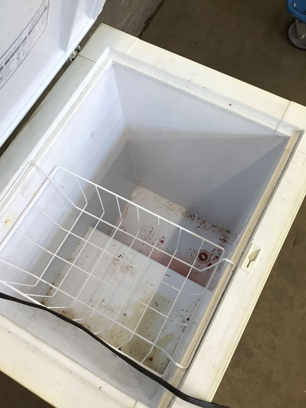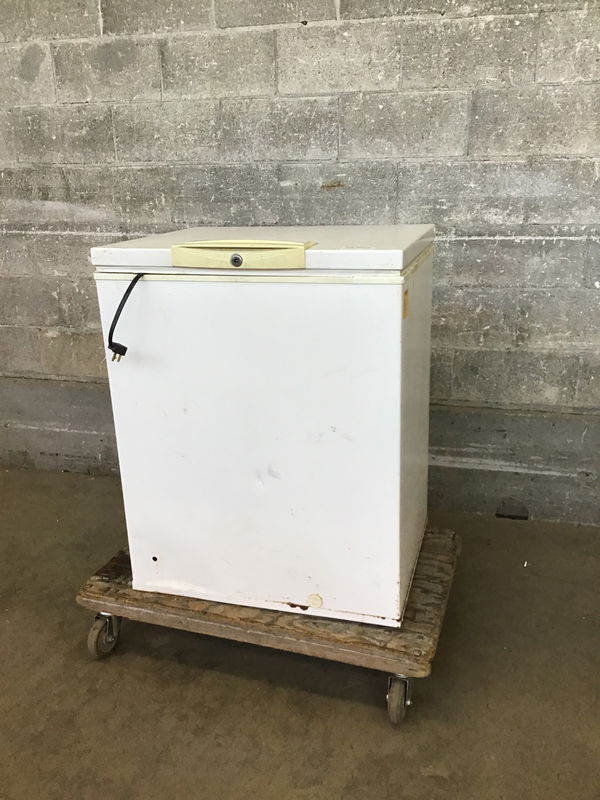 Older Kenmore stand alone deep freezer. Manufacturer date unknown, but due to the yellowing of the plastic trim, I'd guess around 20 years old. Looks like it was stored outside ; appears functional.