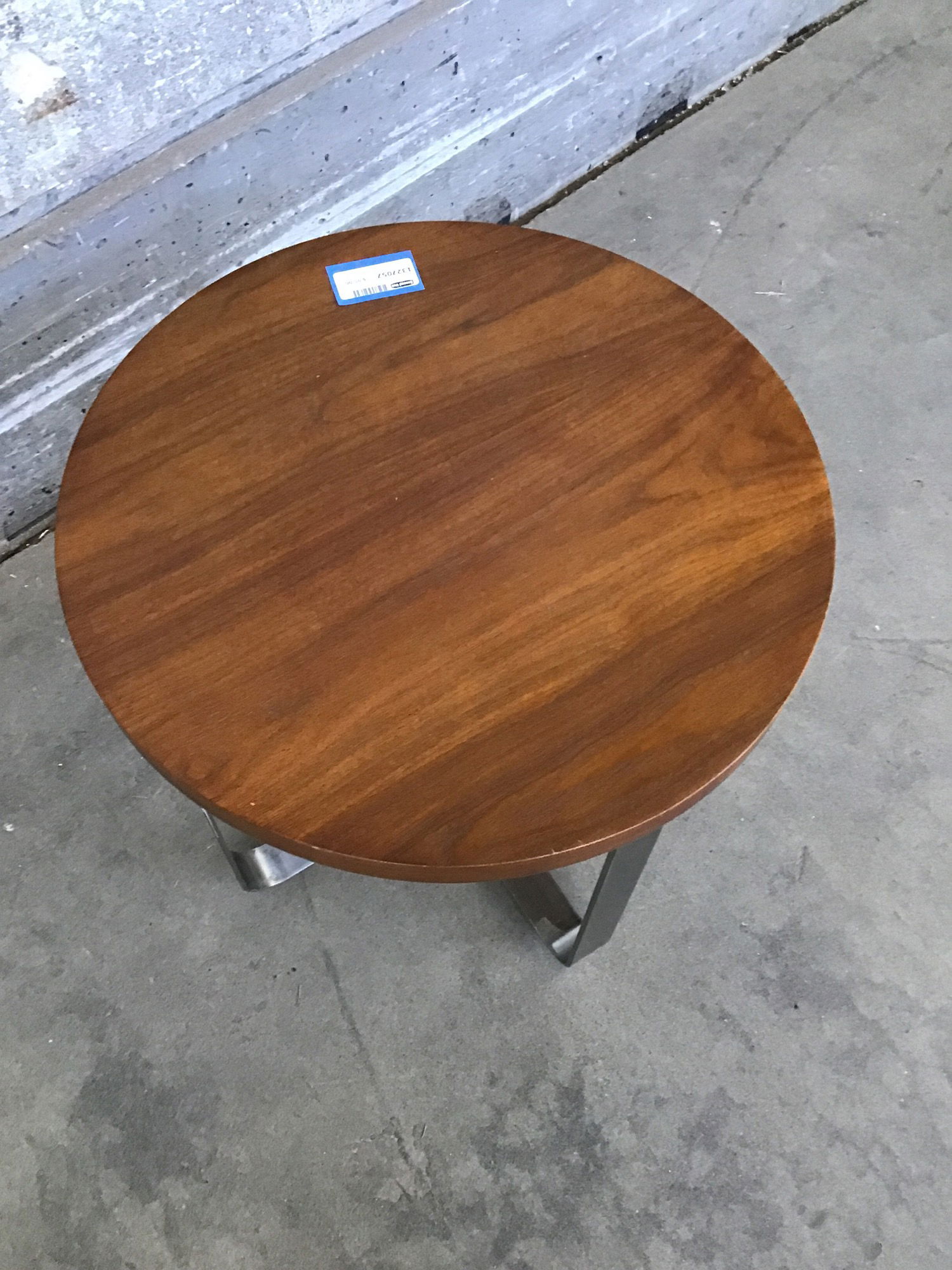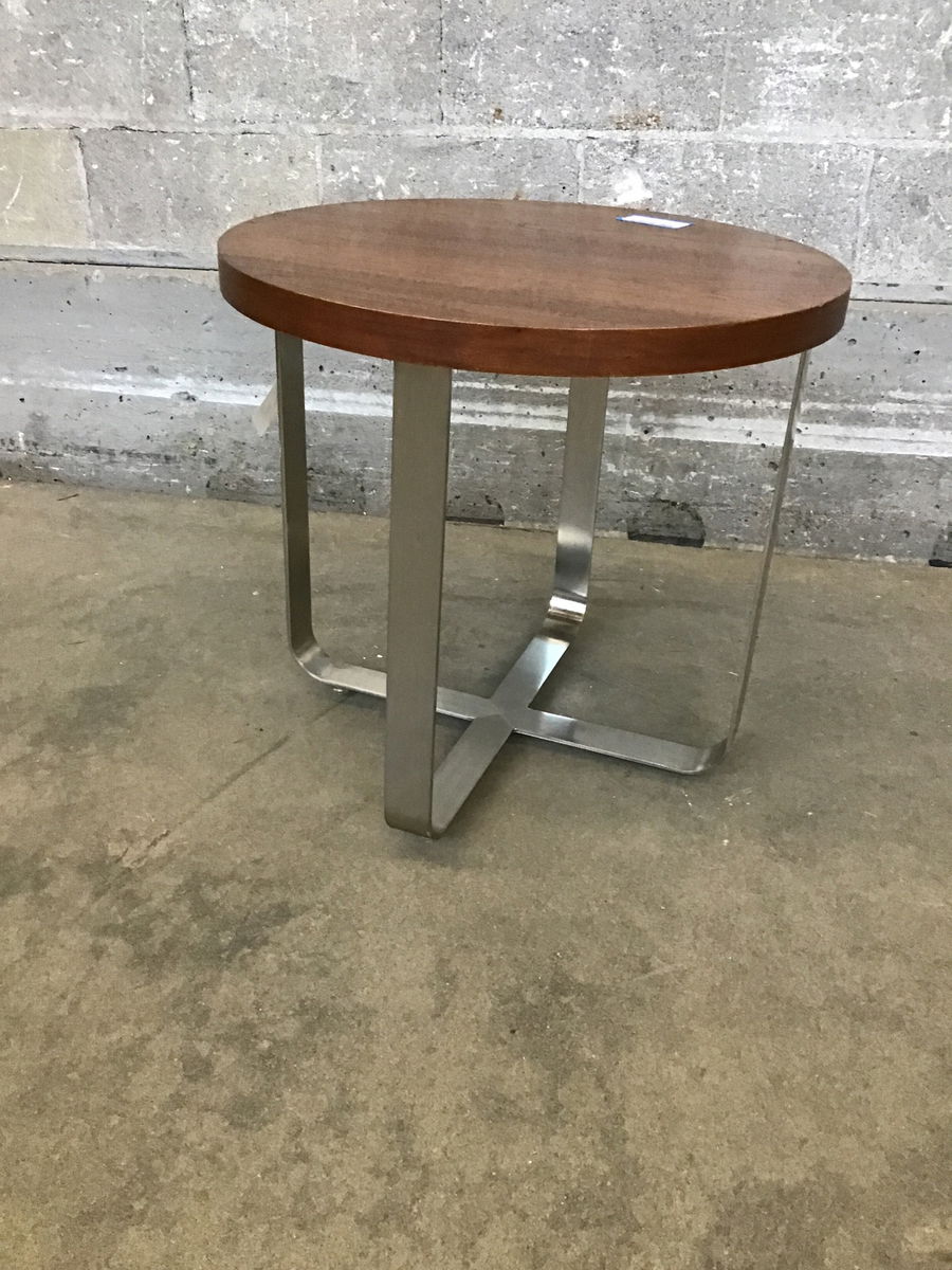 Stylish looking side table with a chrome finished steel base and darkish stained ?walnut? veneer top, which shows some cosmetic wear (scratches and minor puckering).
