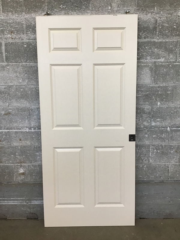 Hollow core interior pocket door with latch and slider track hardware.