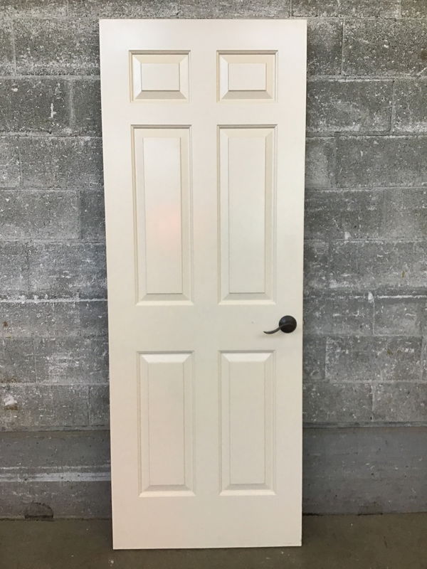 Hollow core interior door with six faux panels and oiled bronze hardware.