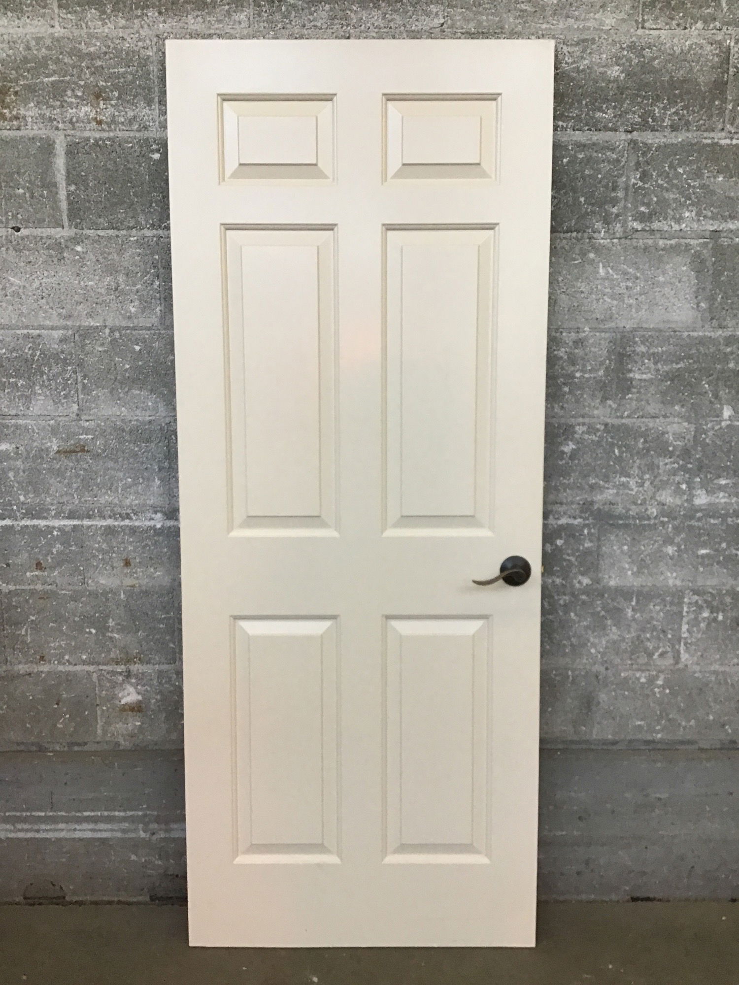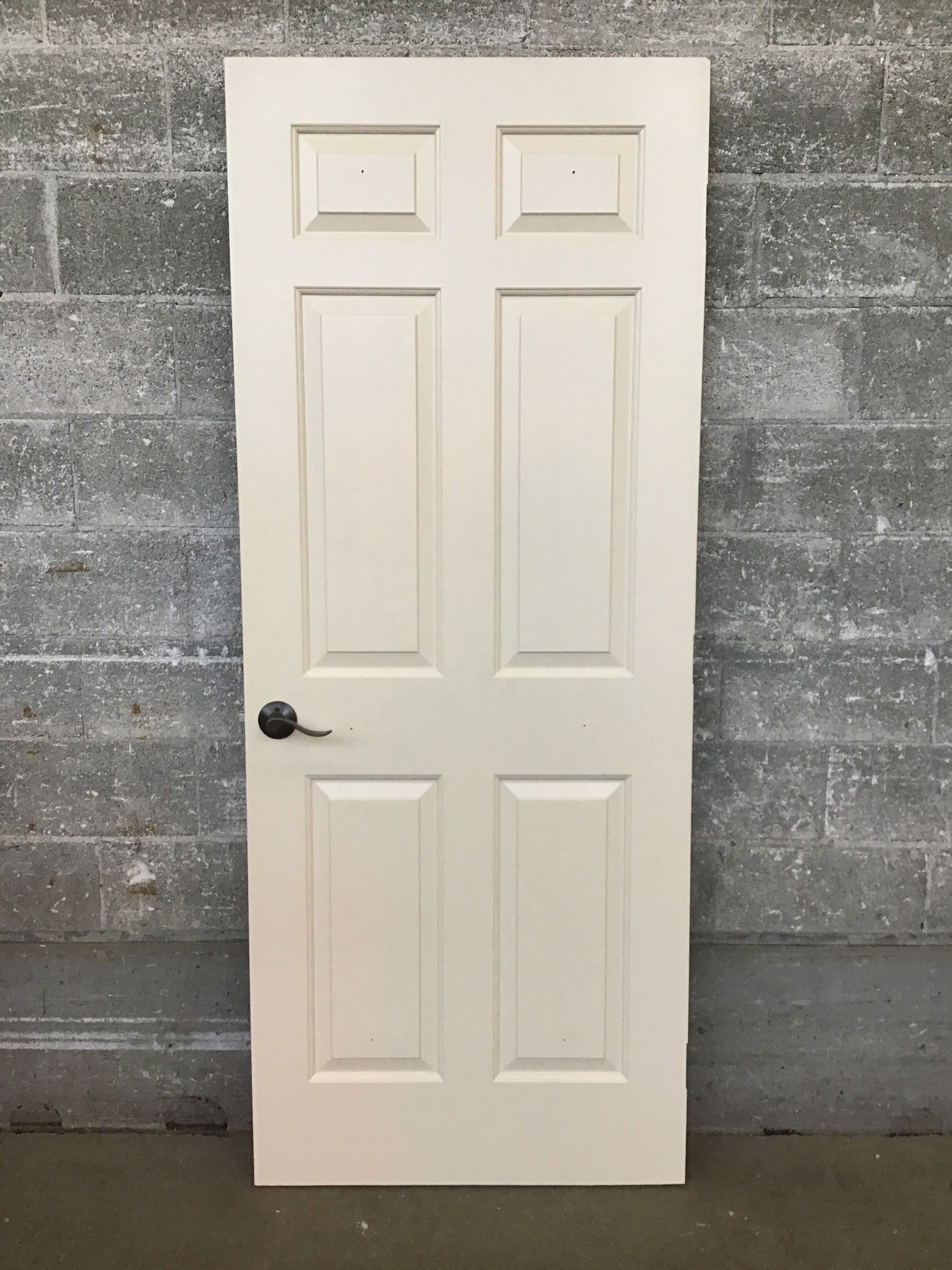 Faux-panelled hollow core interior door with oiled bronze hardware.