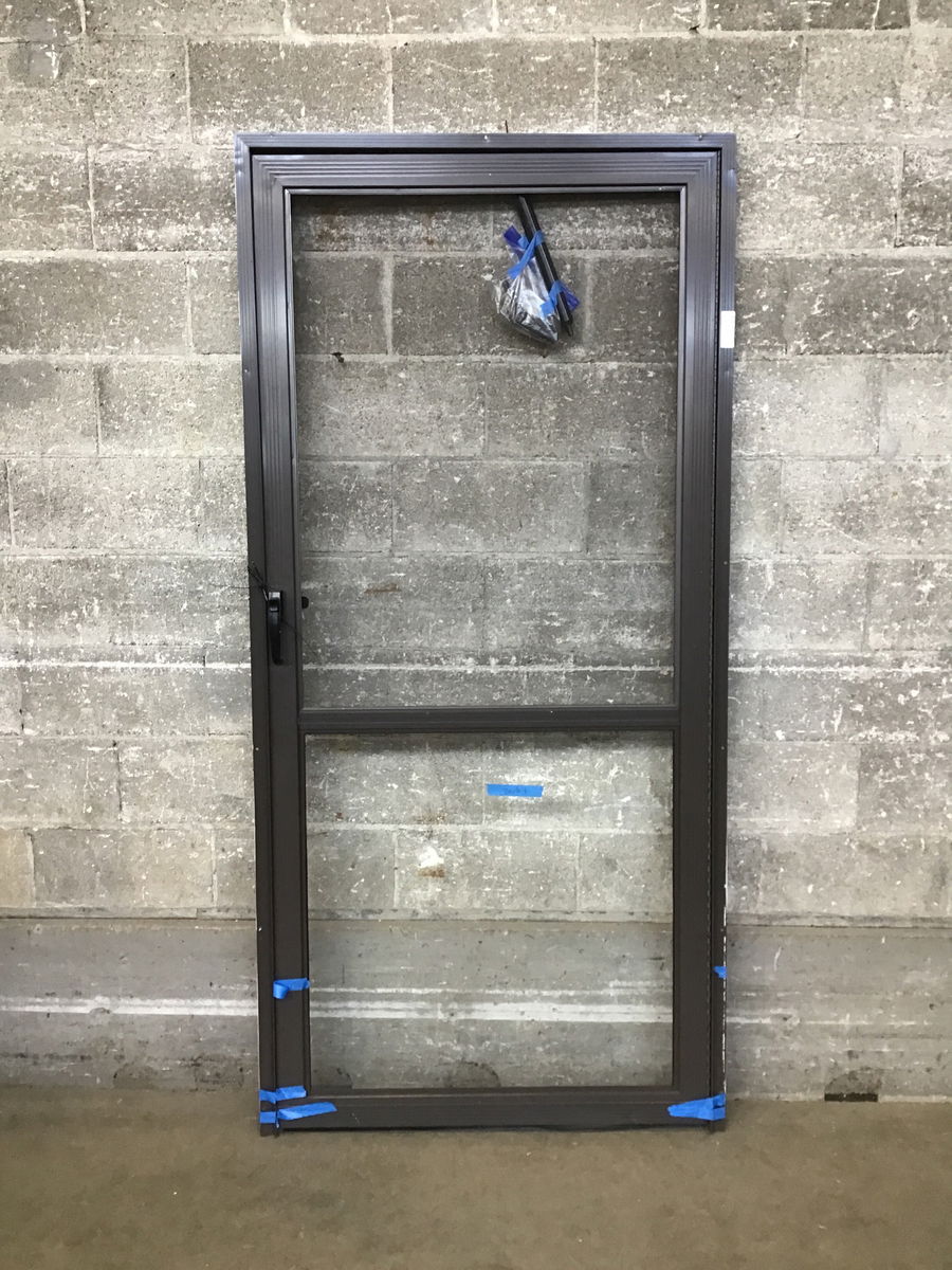 An aluminum storm door with a brown finish and a lower half-lite, with an upper screen lite.