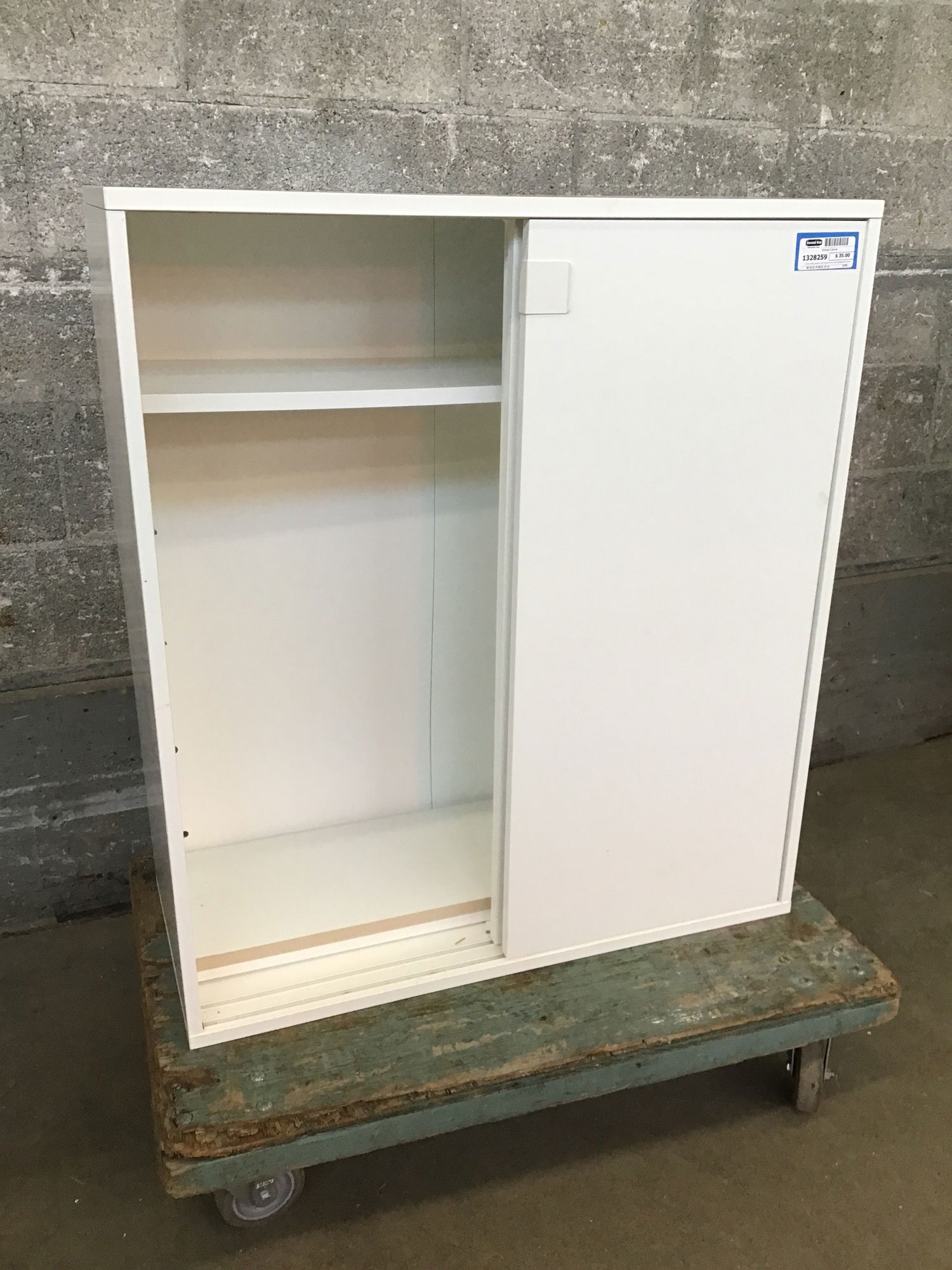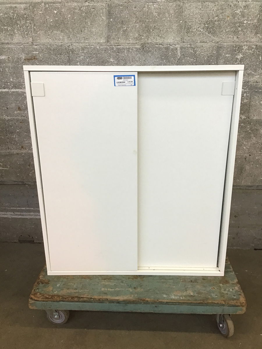 Small white cabinet with bypass doors and adjustable shelves. Would be great in a shop or craft space!