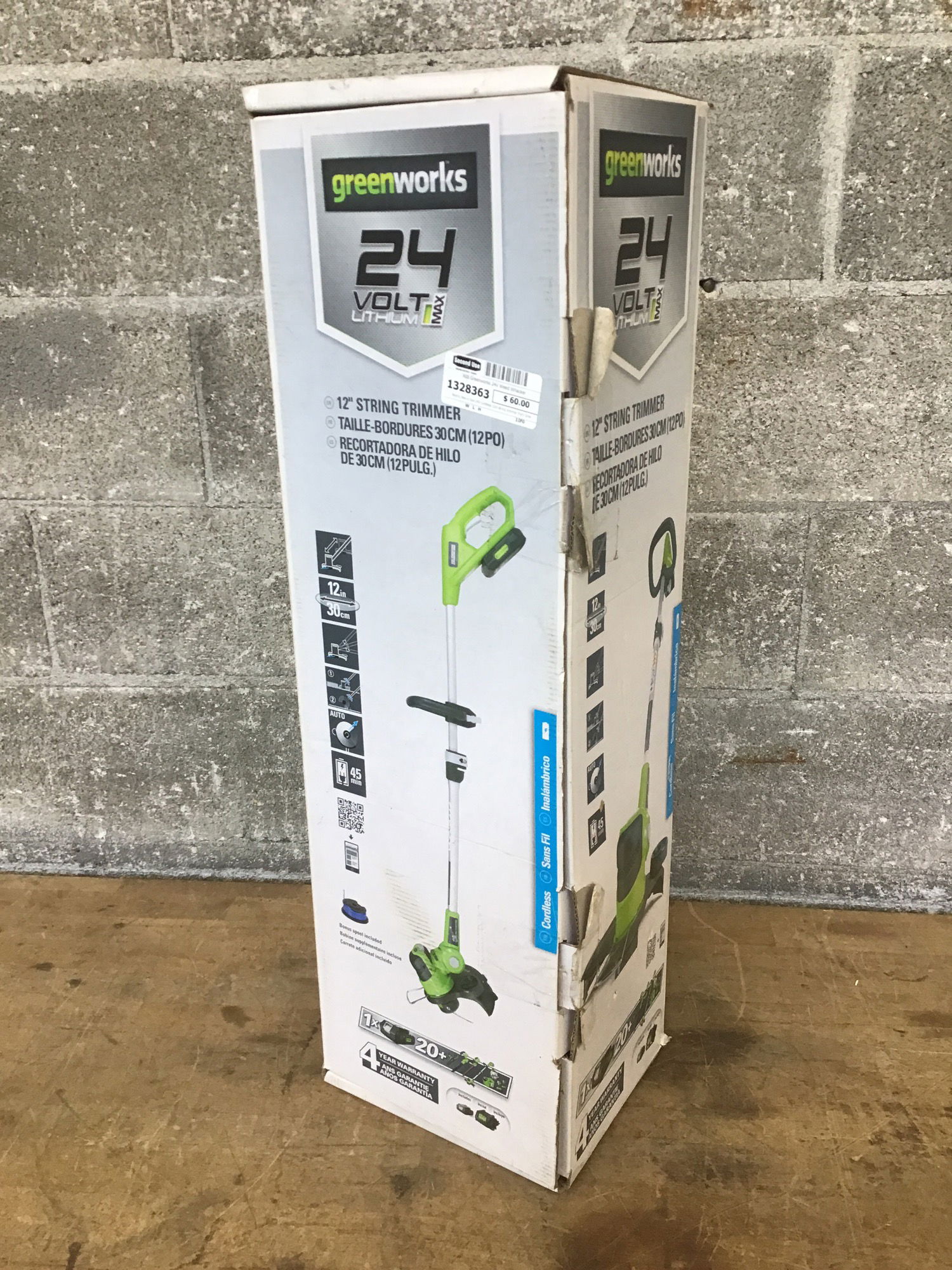 Nearly new in box 24V cordless 12in string trimmer from Greenworks. Looks like the previous owner opened it up and used the battery (which is cross-compatible with most other Greenworks cordless tools) but never touched the trimmer, charger, or accessories! We've reunited the battery with its little family, but the trimmer is being sold untested to preserve its crispy new-ness. Photo is representational. This unit retails for about $90 new.