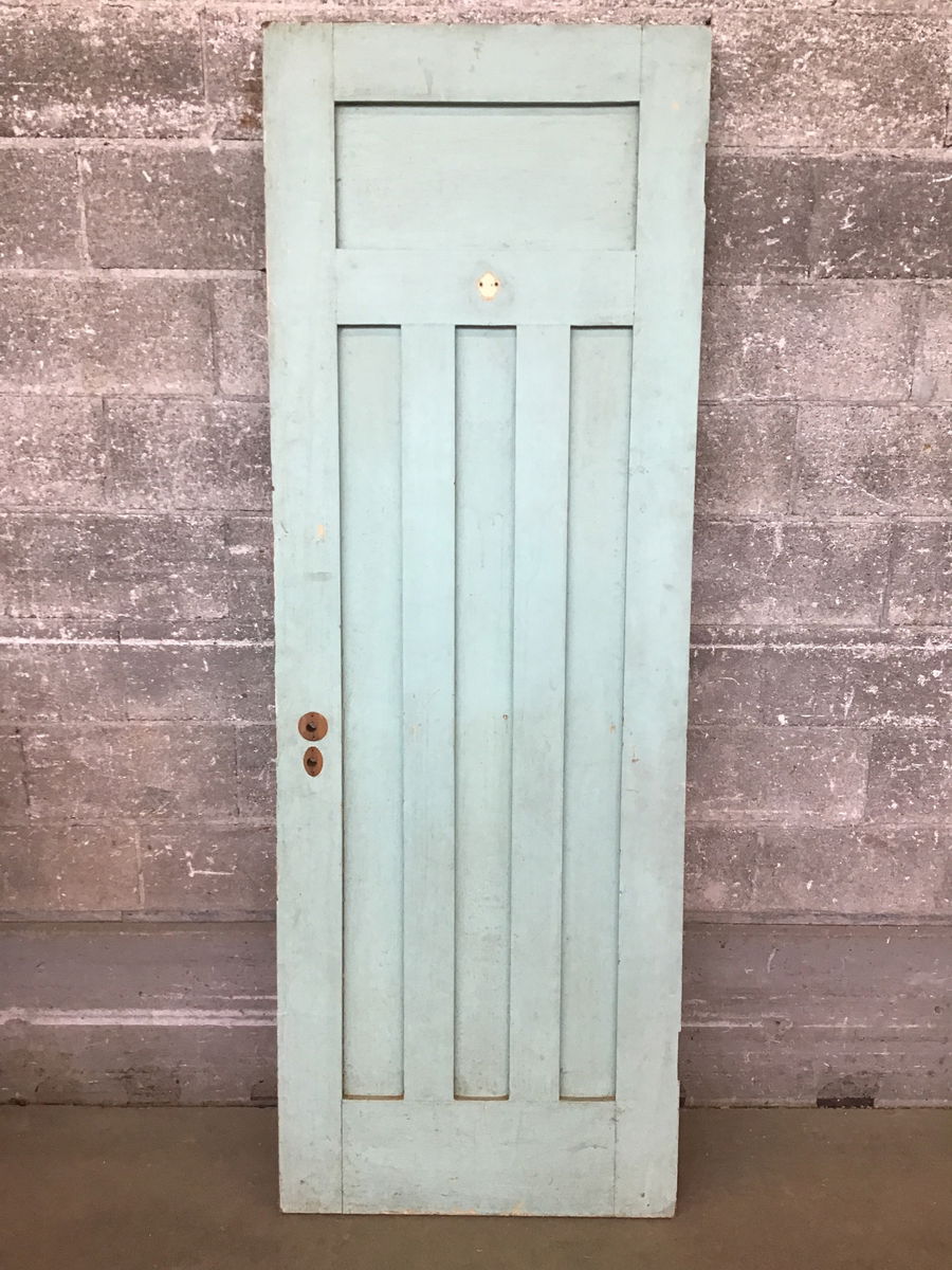 A vintage interior door with a four shaker style panel detail on both sides and a dull aqua painted finish. This would make a good pantry door or closet door for an older house.
